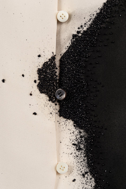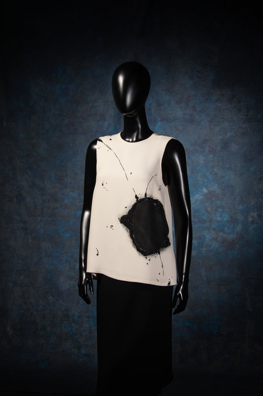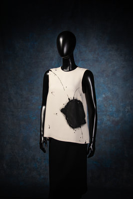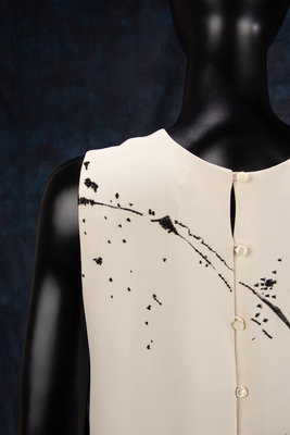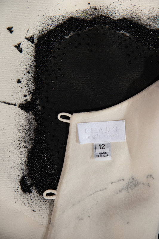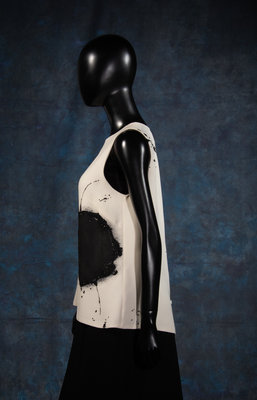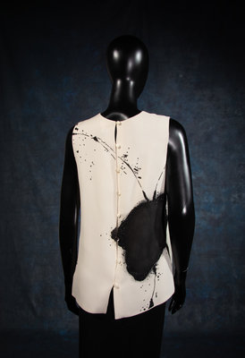 Cream silk crepe sleeveless top with bead embellished black abstract print, rounded neckline, and center back button closures from the Fall 2011 ready-to-wear collection.
