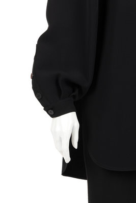Black silk crepe long sleeve tunic with jewel neckline, full cuffed sleeves, and center front hidden button closure. Found with original sales tag, price is missing.