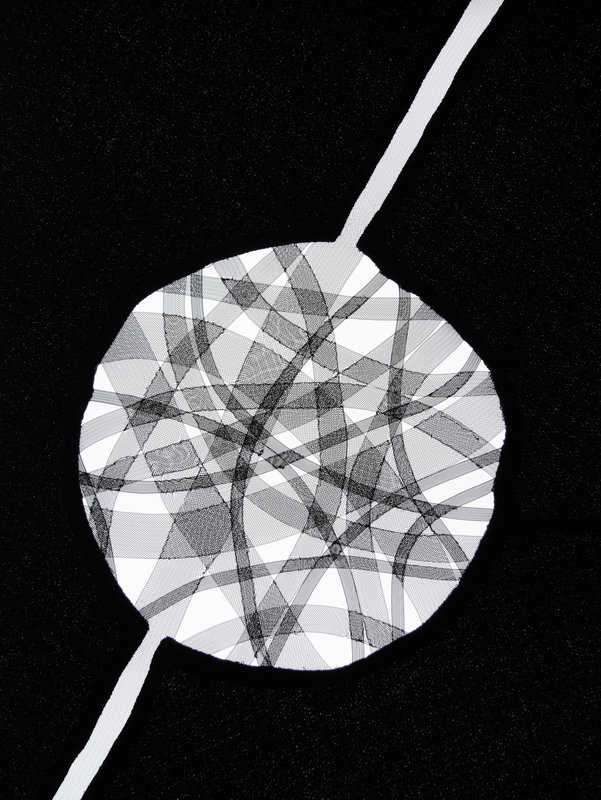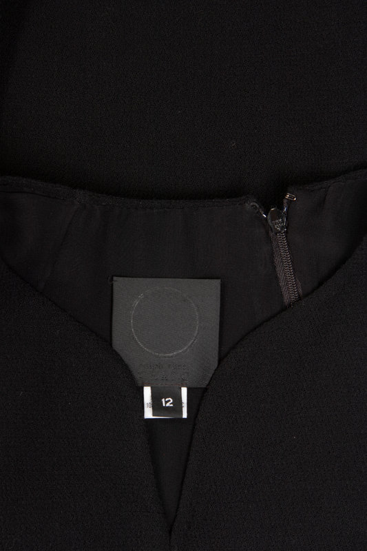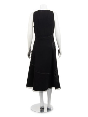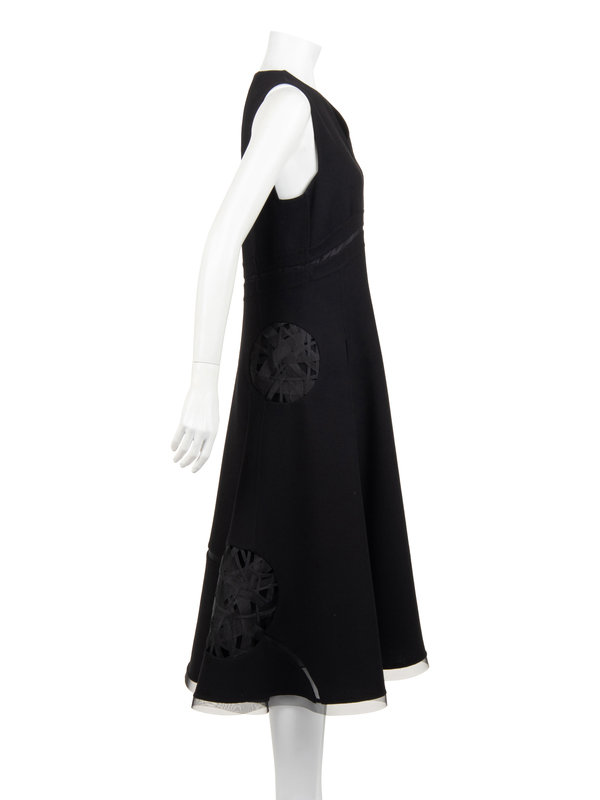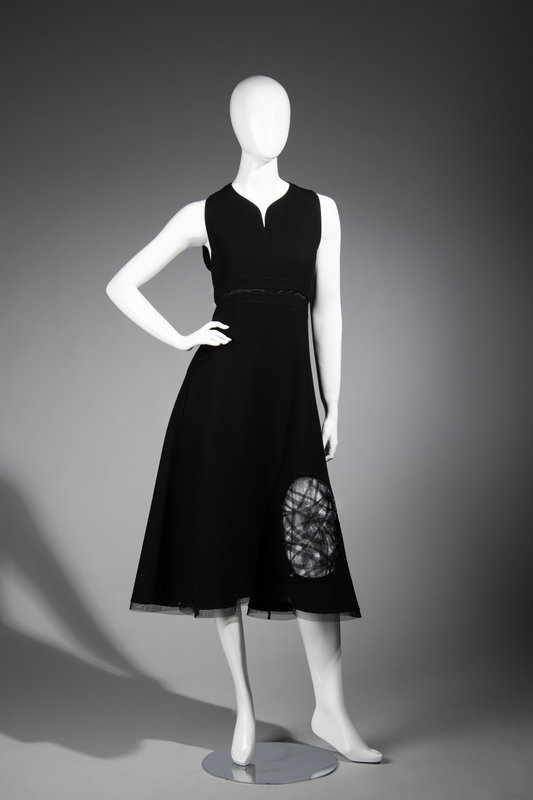 Black wool sleeveless evening dress with black synthetic horsehair braid sculpted circles, high waist with in-seam pockets, flared skirt hemmed with horsehair braid, and asymmetrical back zipper closure.