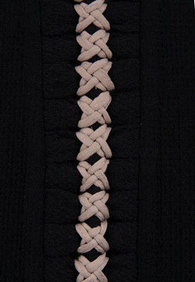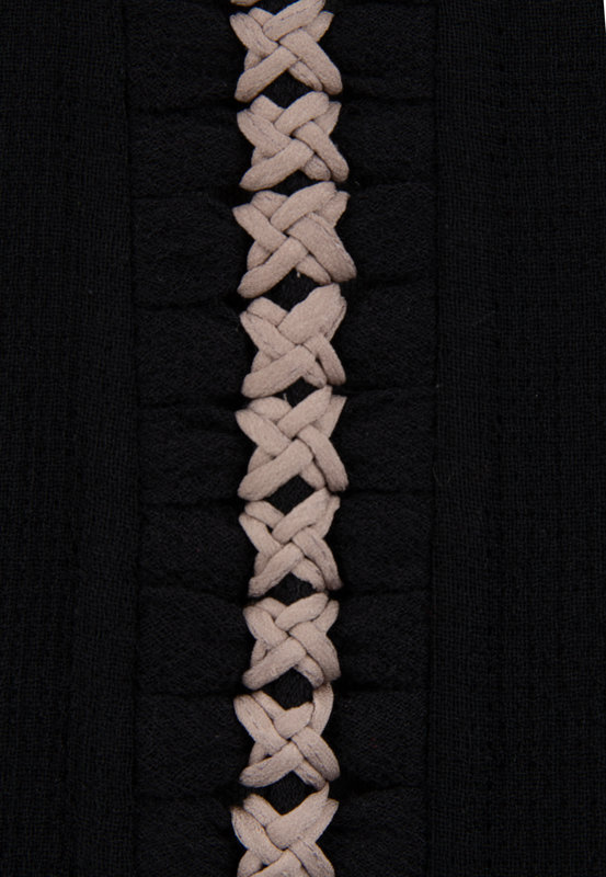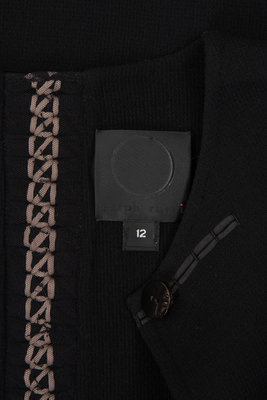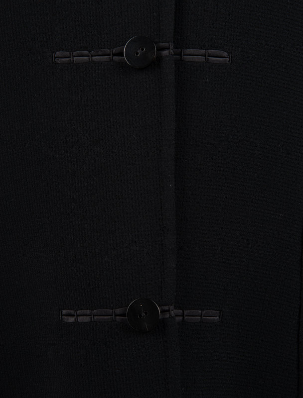 Black wool crepe jacket trimmed with gray knotted fabric at hem, cuffs, and down the center back, and center front button closure.
