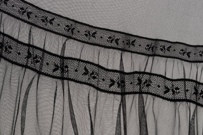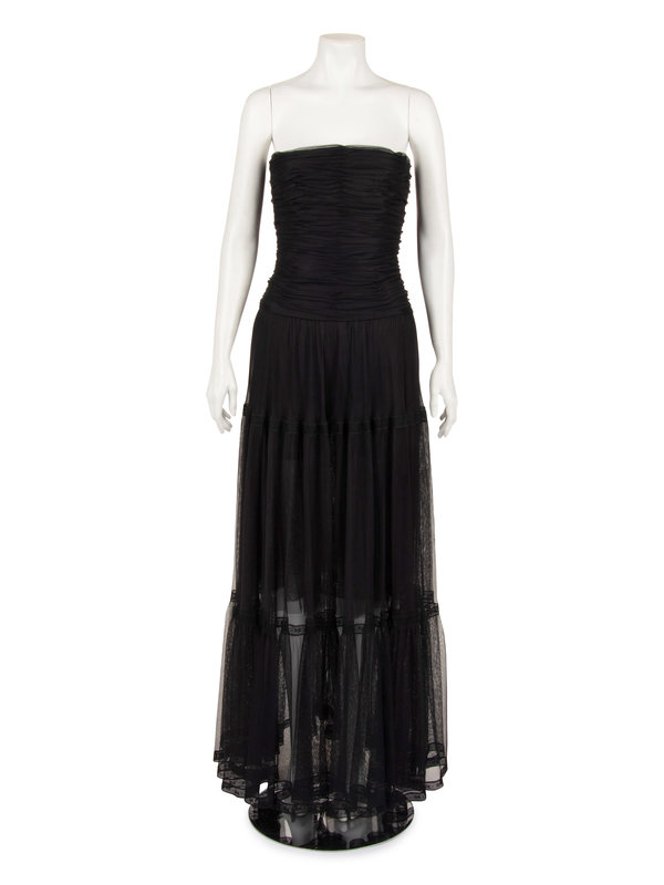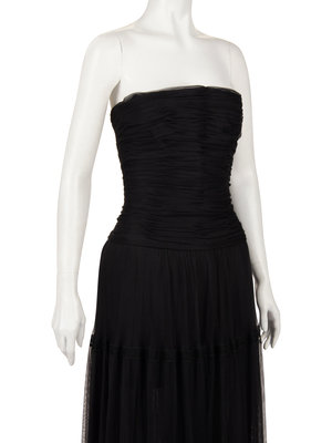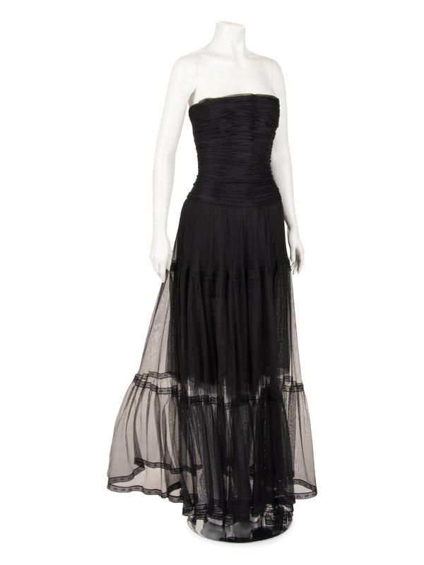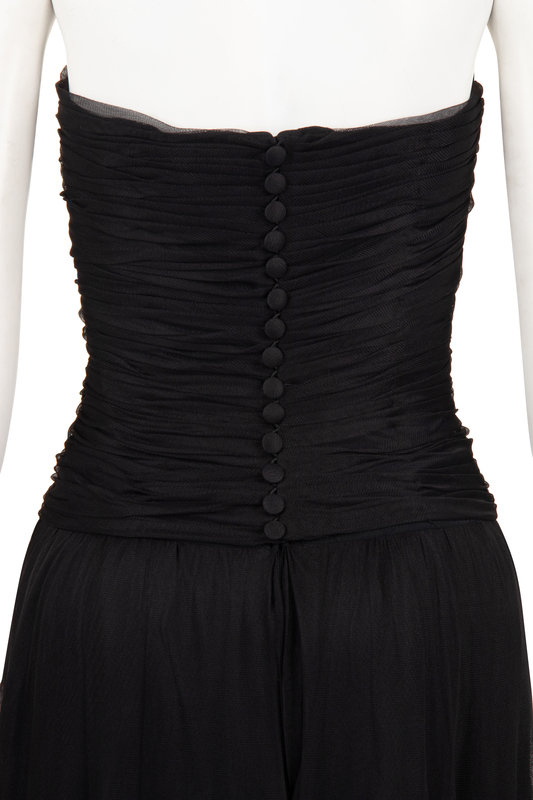 Black nylon net strapless evening dress with ruched structured bodice, full gathered tiered skirt trimmed with lace ribbon, and center back button and zipper closure.