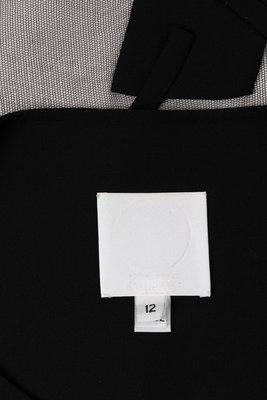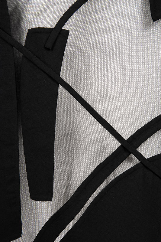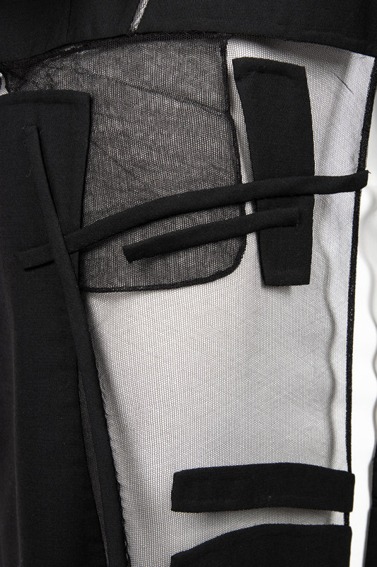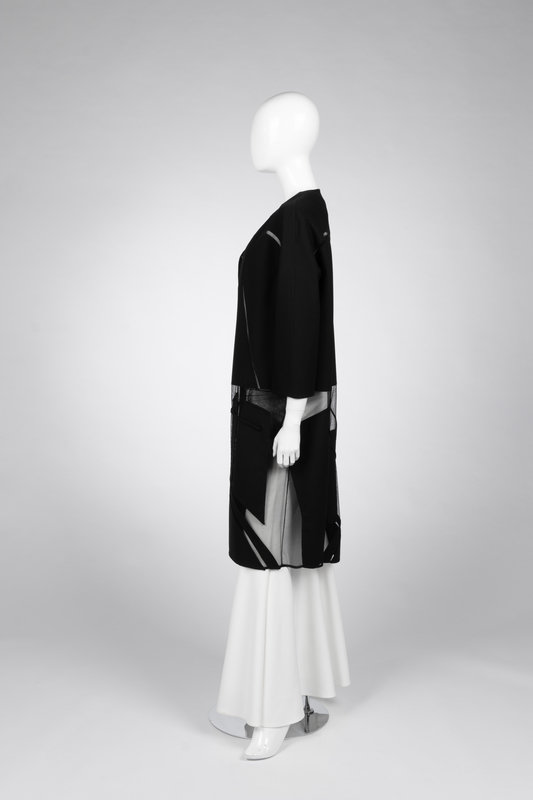 Black wool and silk net open jacket with 3/4 length sleeves, decorative net inserts throughout the bodice, and net bottom with wool patches.