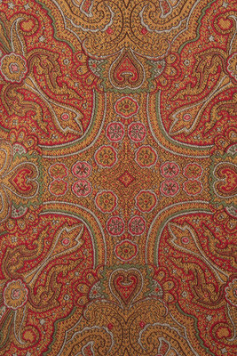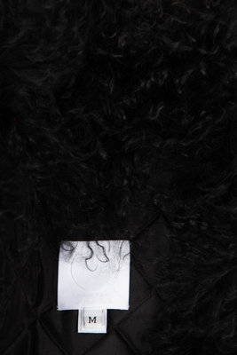Yellow, red, and black cotton/poly blend paisley jacquard overcoat trimmed in black lamb fur and with a quilted interior, built up neckline, flared sleeves, front welt pockets, and front covered placket button closure.