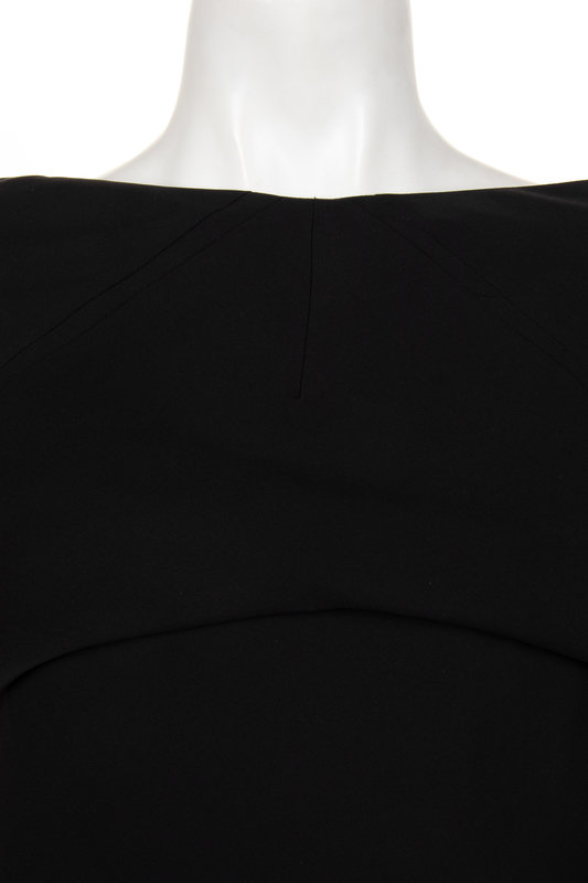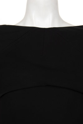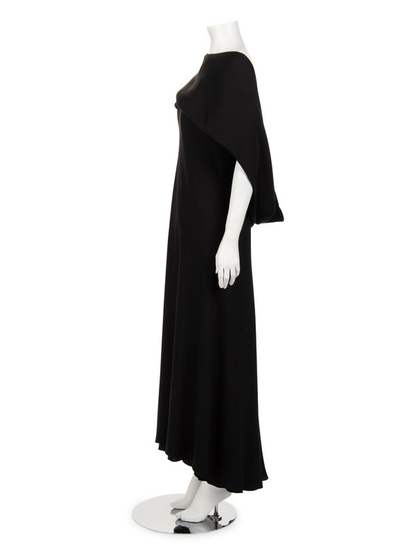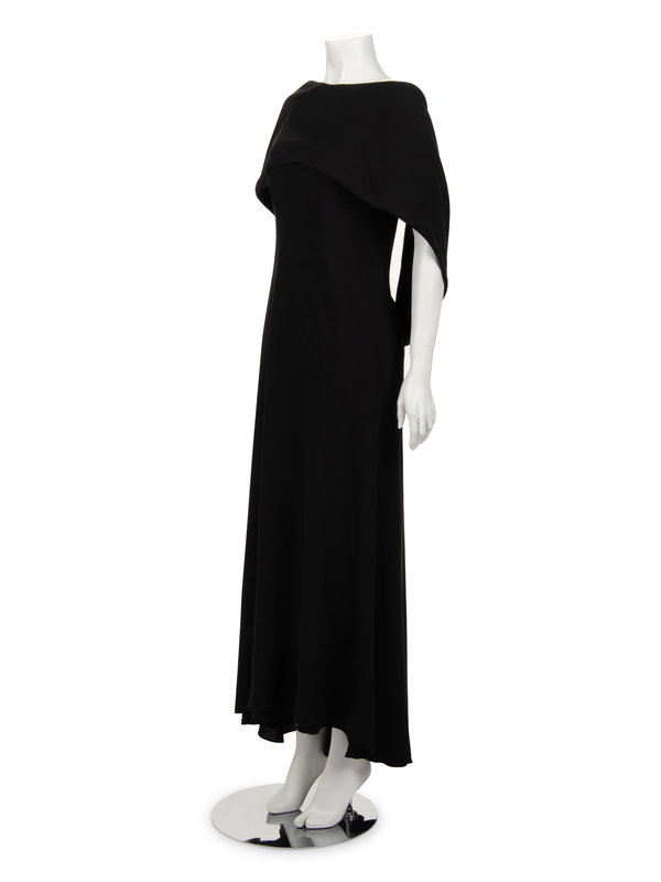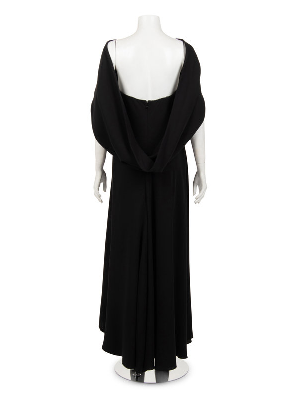Black silk crepe strapless dress with full hemline and center back zipper closure; paired with matching shrug.