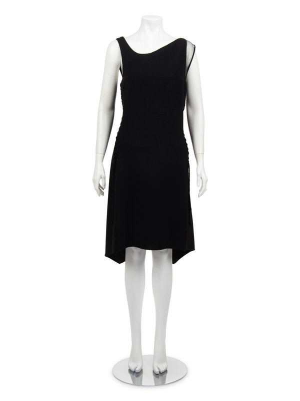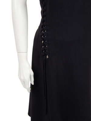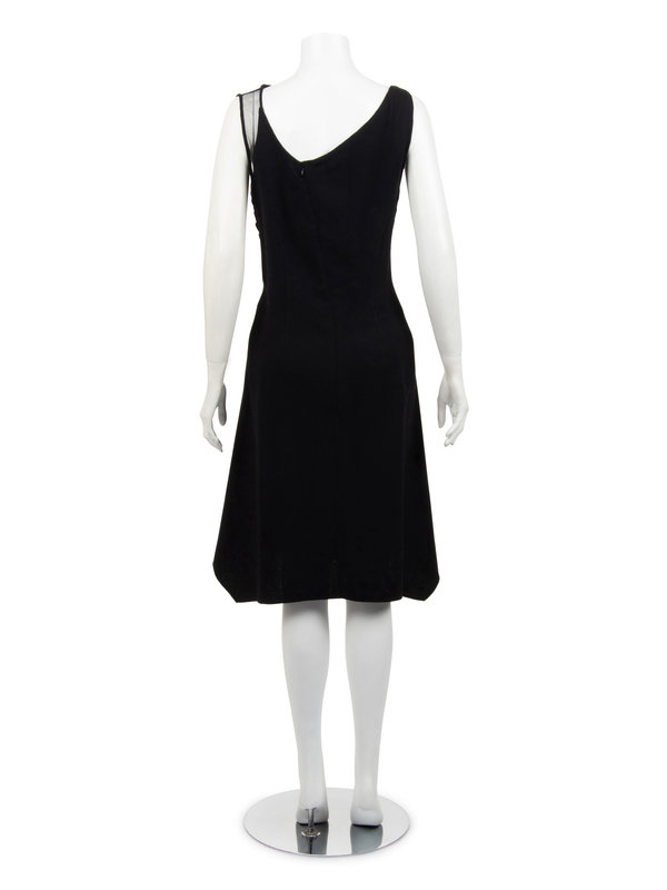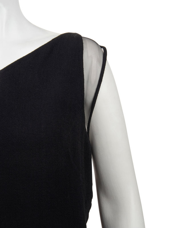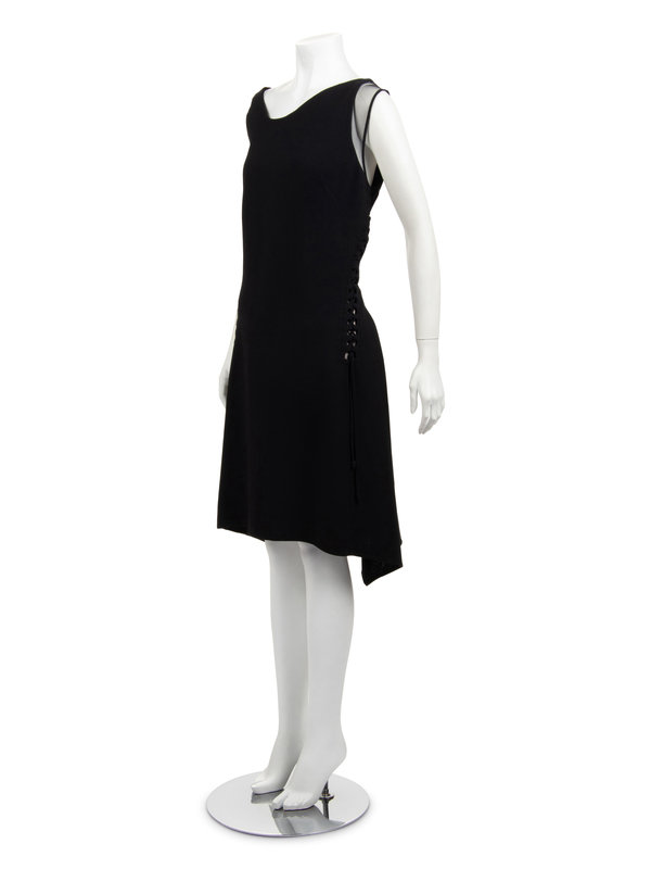 Black wool crepe sleeveless dress with front scoop neckline, left shoulder trimmed in black net, lace-up side seams with rolled crepe strips, uneven hemline, and asymmetrical back zipper closure.