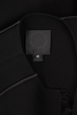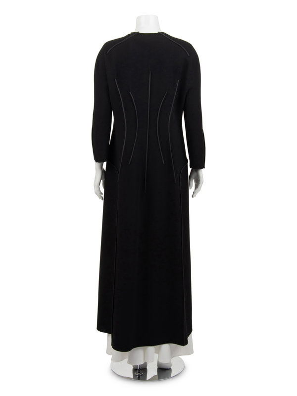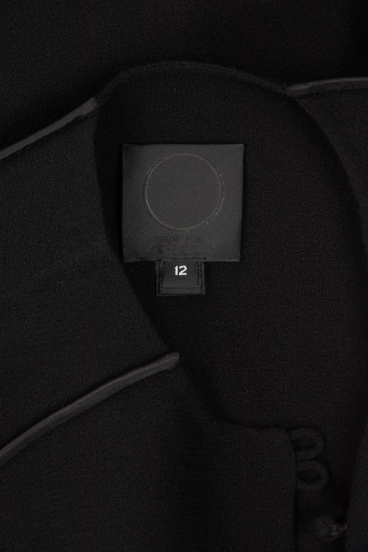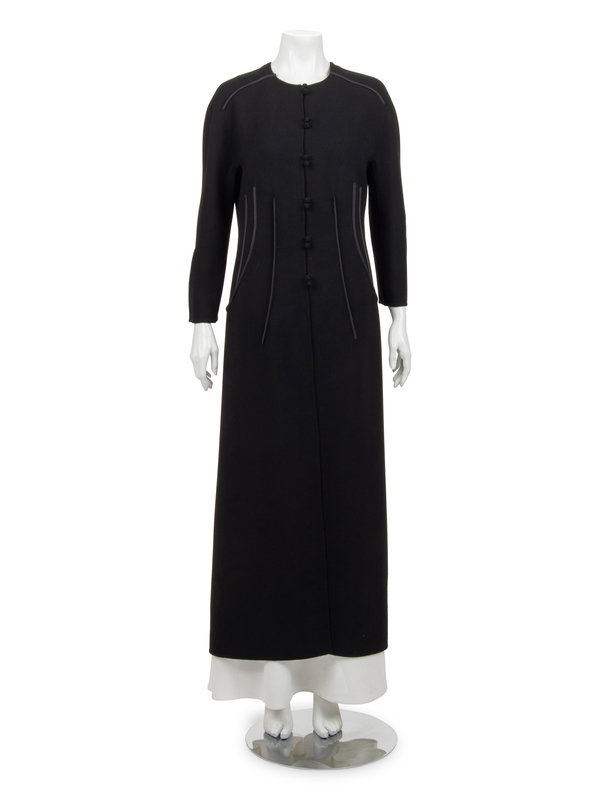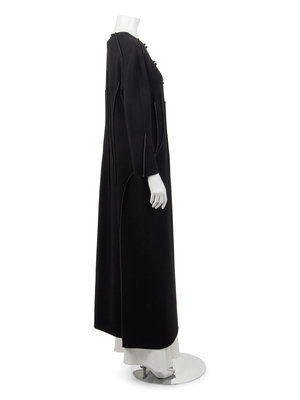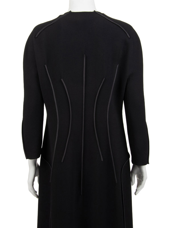 Black wool crepe coat with decorative taffeta covered seams at shoulder, waist, and back, jewel neckline, and center front double button closure.