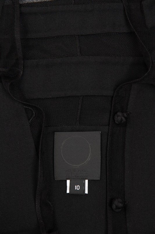 Black silk net A-line jacket pieced with patches of black wool crepe, a built-up neckline, flared sleeves, and center front knotted button closure.