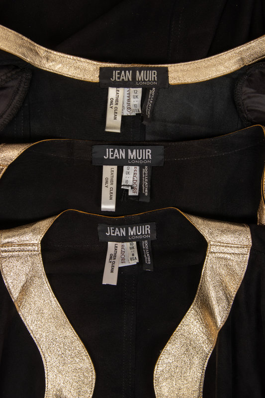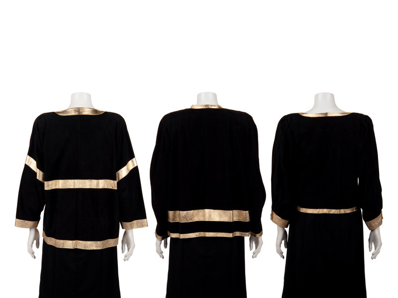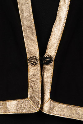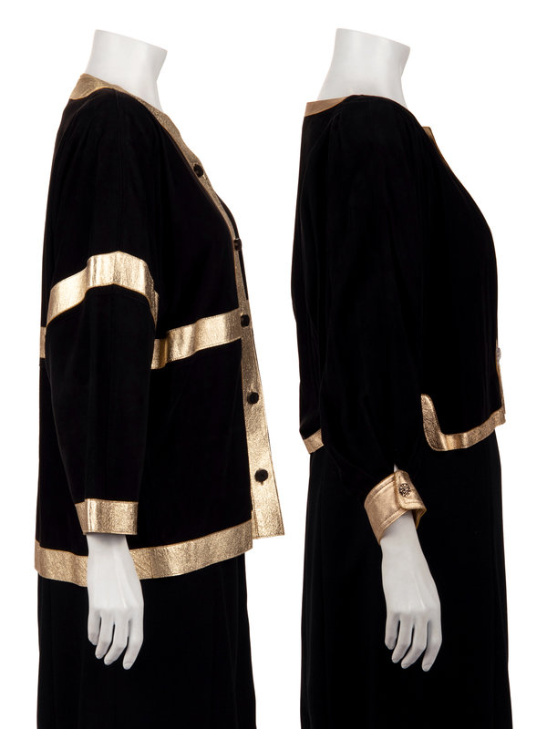 Black suede swing jacket trimmed in metallic gold leather, high V-neckline, top stitched shoulder pleats, pieced long sleeves hemmed in metallic gold leather, open front with single button closure at neckline.