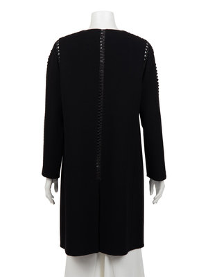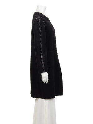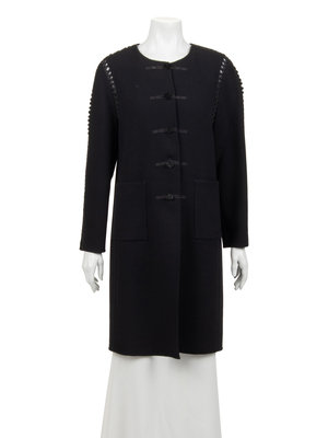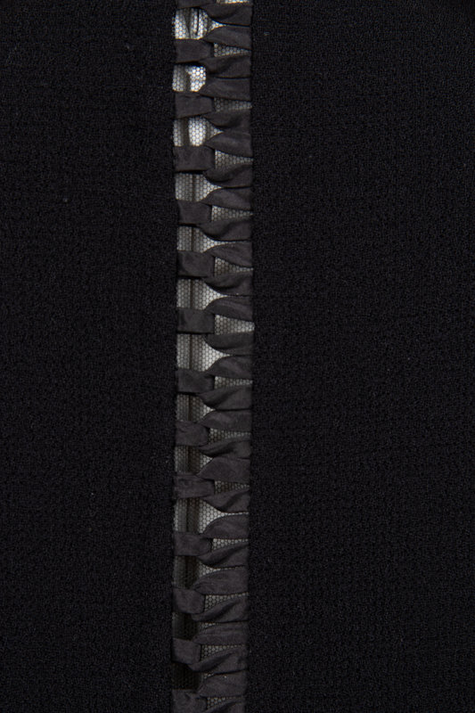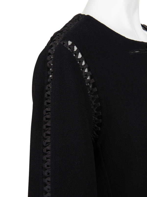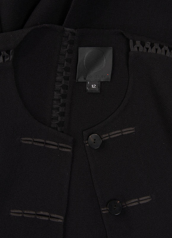 Black wool crepe jacket with interlocked satin ribbon detail over netting along the seams and center front button closure.
