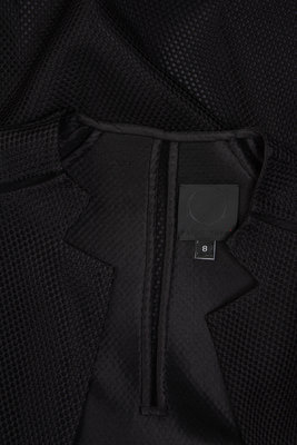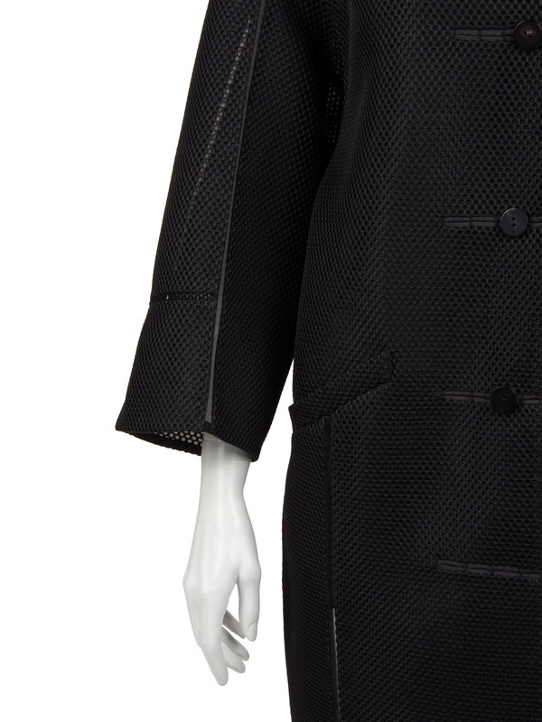 Black polyester 3D mesh jacket with net inserts on sleeves and center back neckline, front welt hip pockets, and center front button closure.