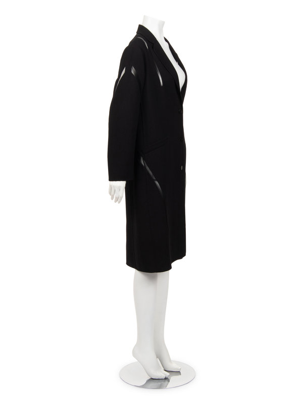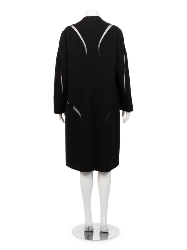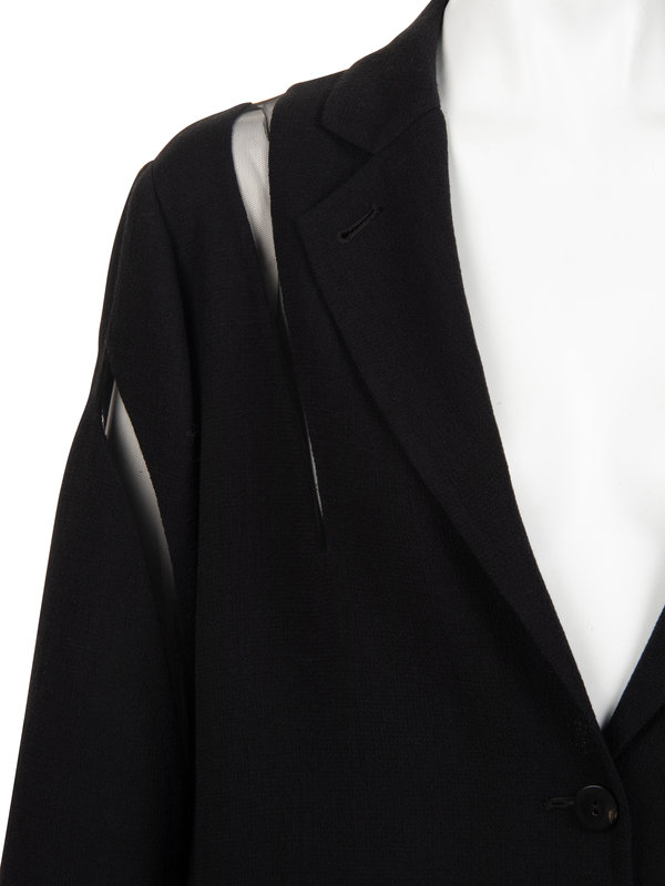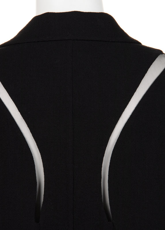 Black wool crepe jacket with curved black net inserts along shoulders, sleeves, and hips, notched lapel, front hip welted pockets, and center front button closure.