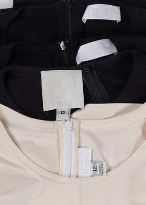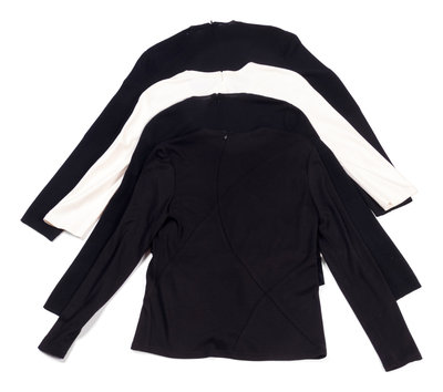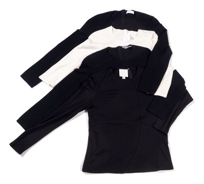 Black silk knit long sleeve pieced top with curved back zipper closure.