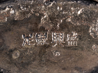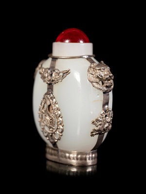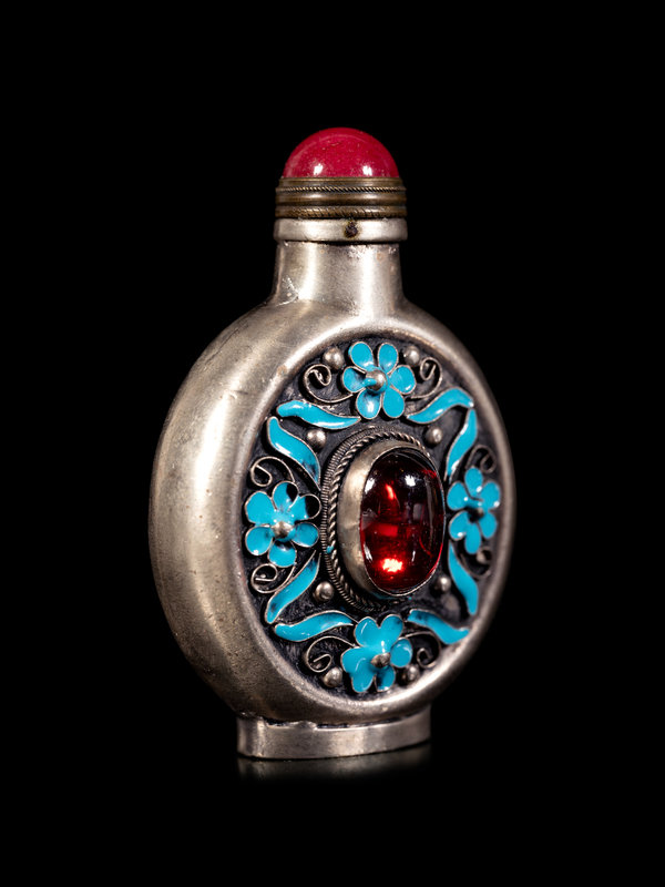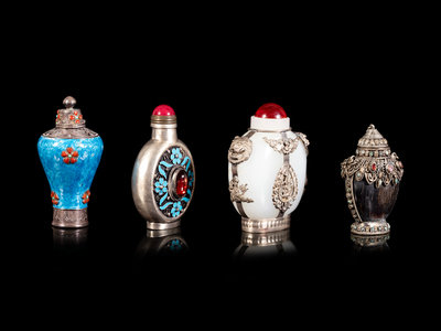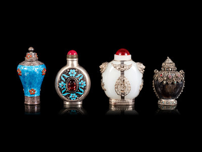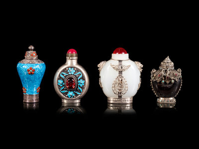 the first in miniature meiping form, the main panel enameled blue and incised with meandering vines, with hardstone inlays depicting prunus blossoms; the second a circular example, both sides centered with a hardstone inset, surrounded by blue enameled flower heads; the third a silver mounted white glass example; the fourth a hardstone inset silver mounted example.