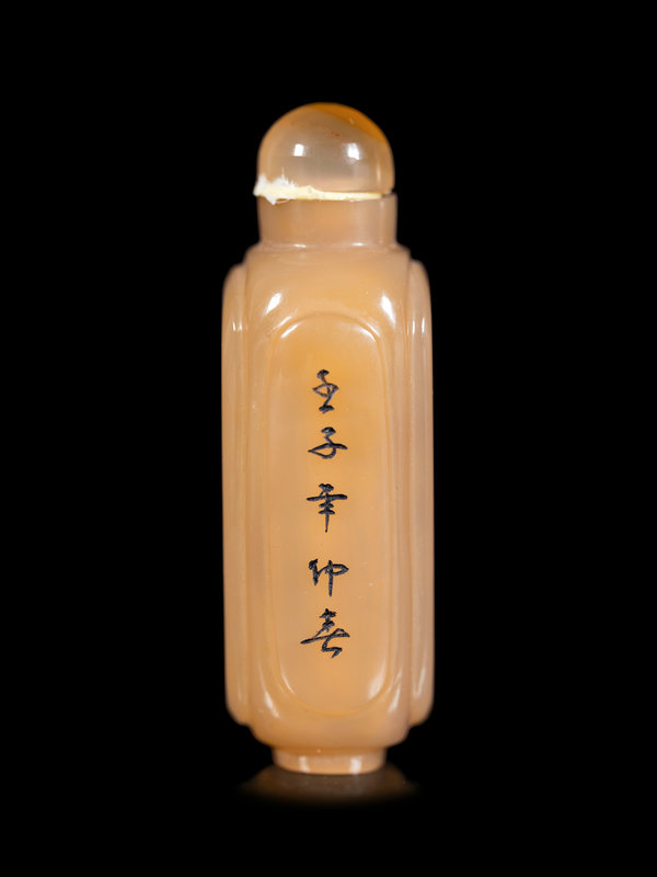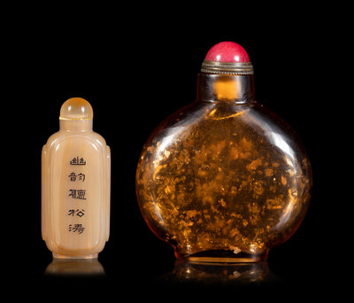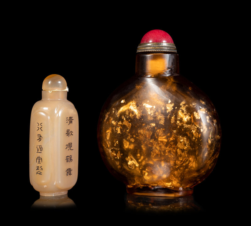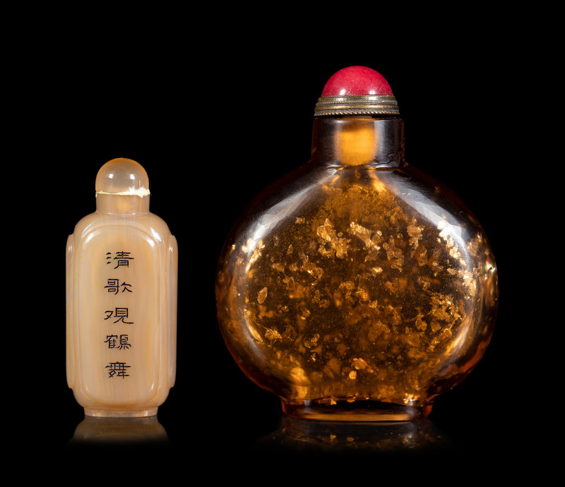 the first an agate example, of rectangular form, all four sides carved with inscriptions and highlighted in black enamel, with a matching stopper; the second a gold splashed amber-tone bottle, of flattened circular form, raised on a short straight foot.