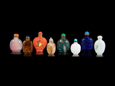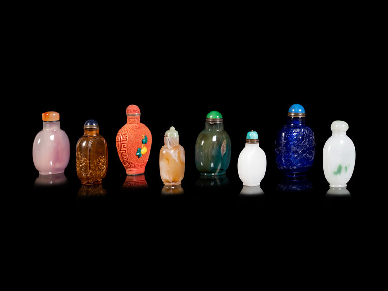 of various forms, imitating rose quartz, cinnabar lacquer, agate, spinach jade, jadeite and sapphire.