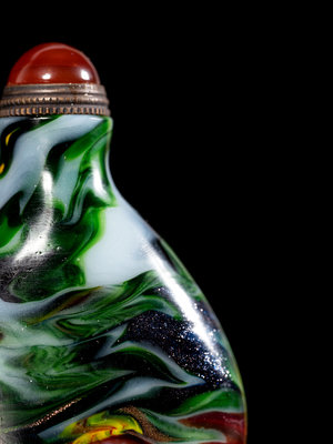 comprising an olive-green example, a white overlay amber-tone example, carved with horses, a red overlay transparent blue glass example, decorated with bats amongst clouds, a multi-colored example, a green glass faceted example and a yellow cylindrical-form example.
