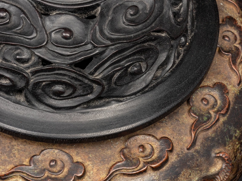 of compressed globular form, resting on a slightly concave countersunk base and rising to an incurving lipped rim, the shoulders flanked by a pair of mythical beast heads.