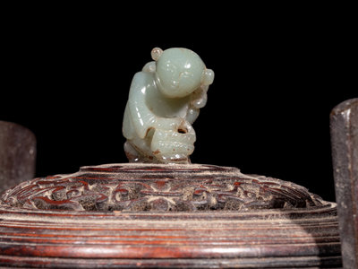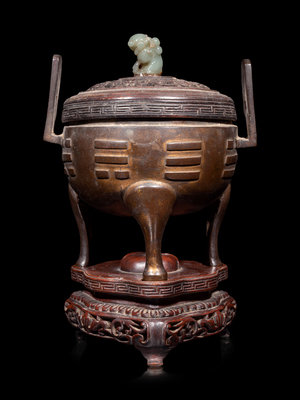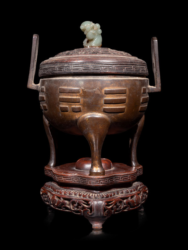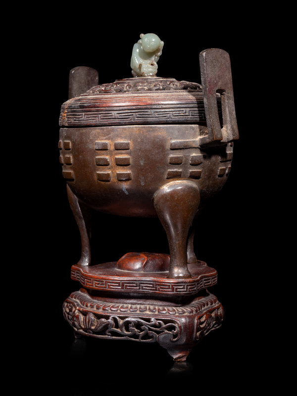 the compressed body rising from three curvilinear feet, cast with trigrams, and flanked with tall rectangular handles, all surmounted by a carved hardwood cover terminating in a hardstone finial.