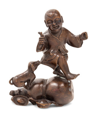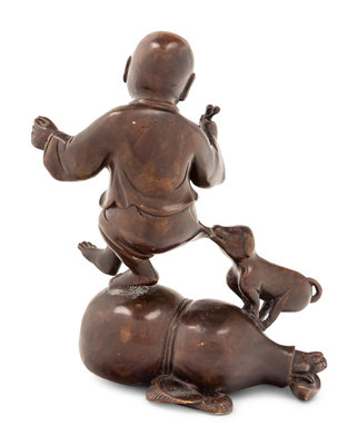 showing a boy clad in simple clothing holding a biscuit atop an overturned double gourd next to a dog playfully tearing at the his trousers and challenging his balance.