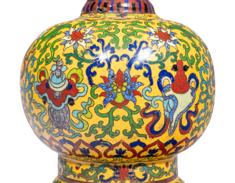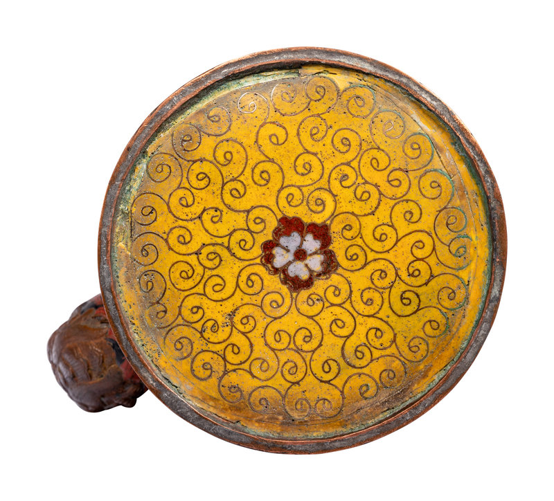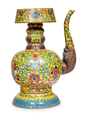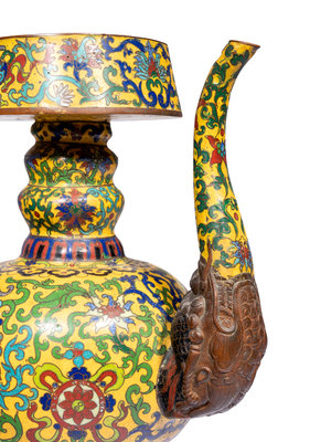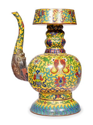 the bulbous body rising from a circular splaying foot, having a large spout issuing from a mythical beast head and enameled with fish against lotus scrolls.