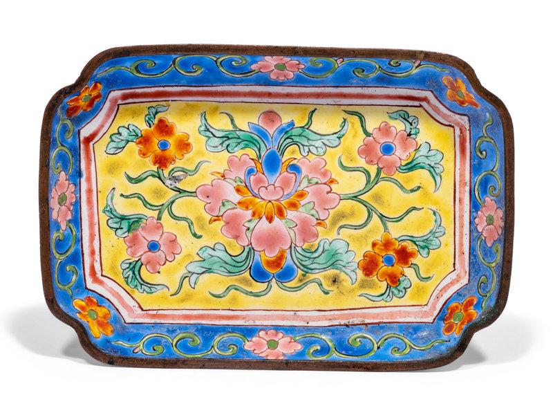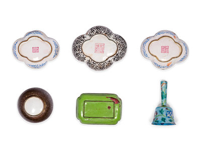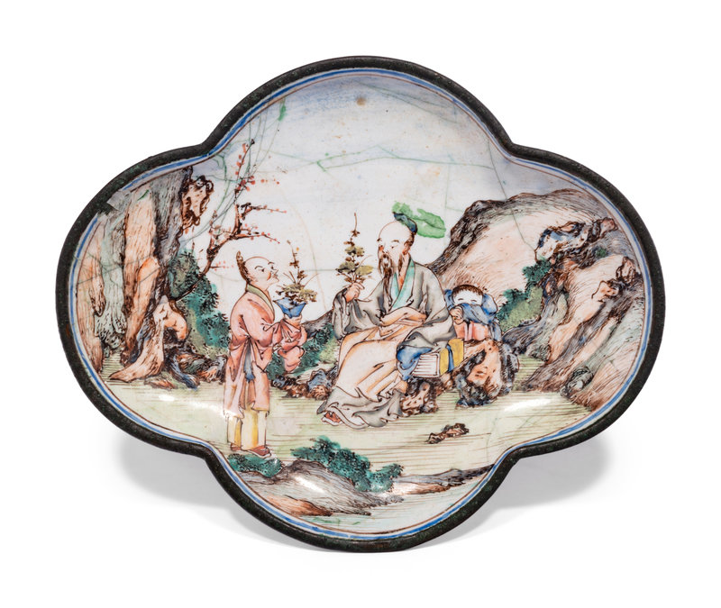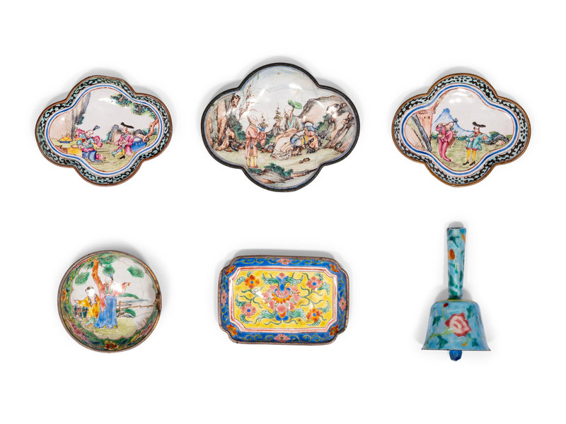 comprising three begonia-form dishes enameled with figures against sectioned white ground reserves, one circular example, a rectangular example with canted corners, and a bell.