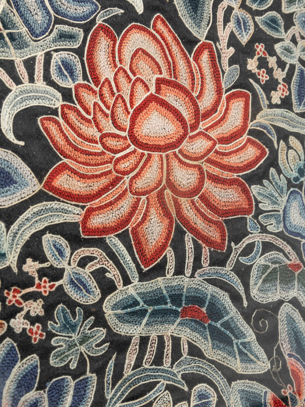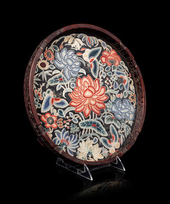 A Chinese Embroidered Silk Inset Hardwood Circular Tray