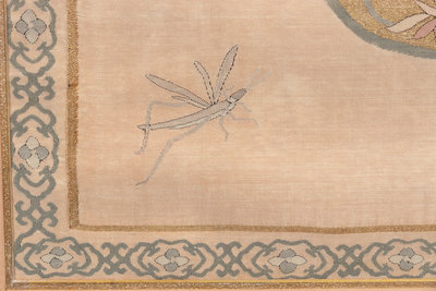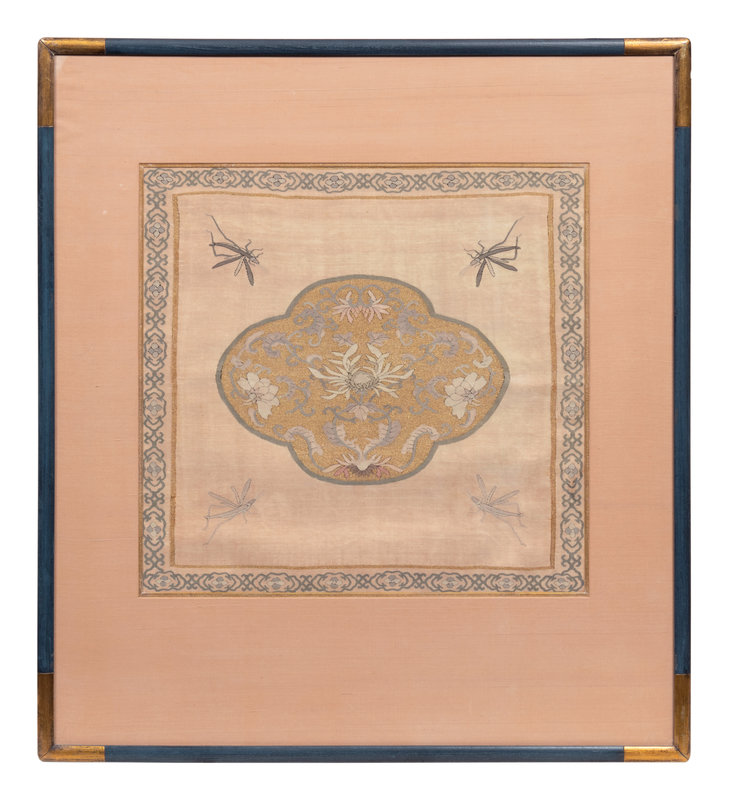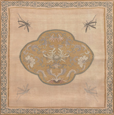 finely worked in cream and pale blue threads of square form, showing a central lozenge roundel of gilt metallic threads surrounded by four delicately picked out insects.