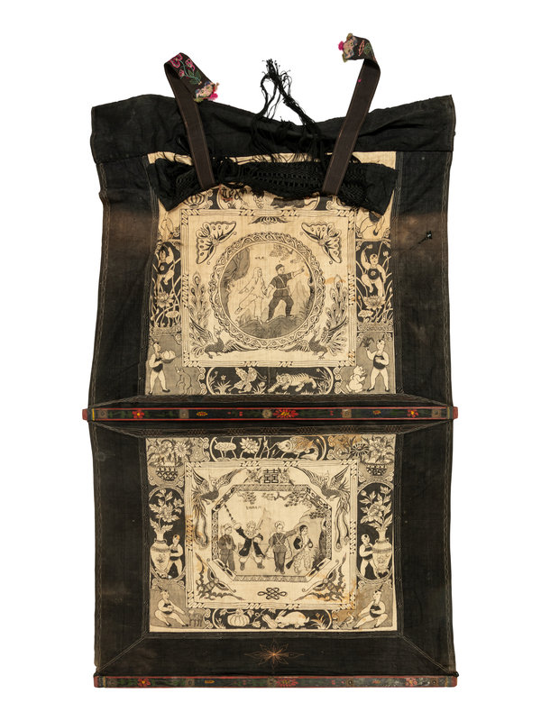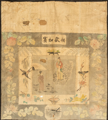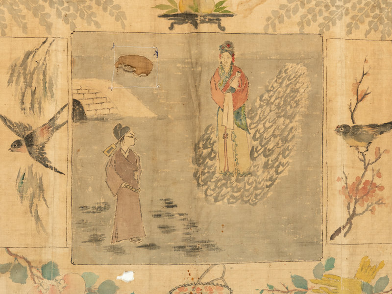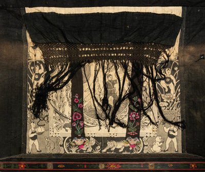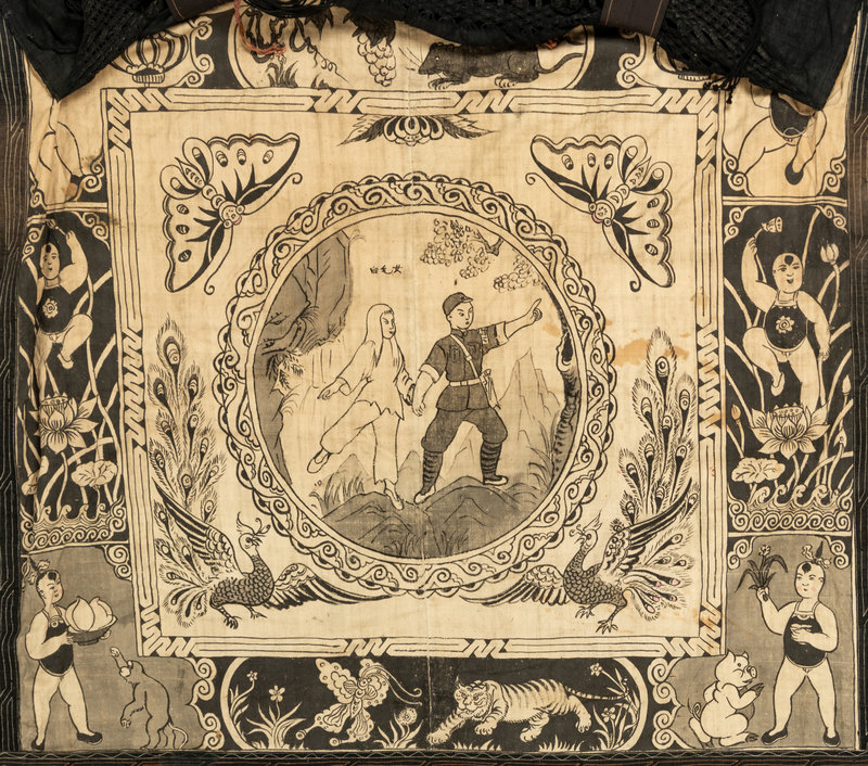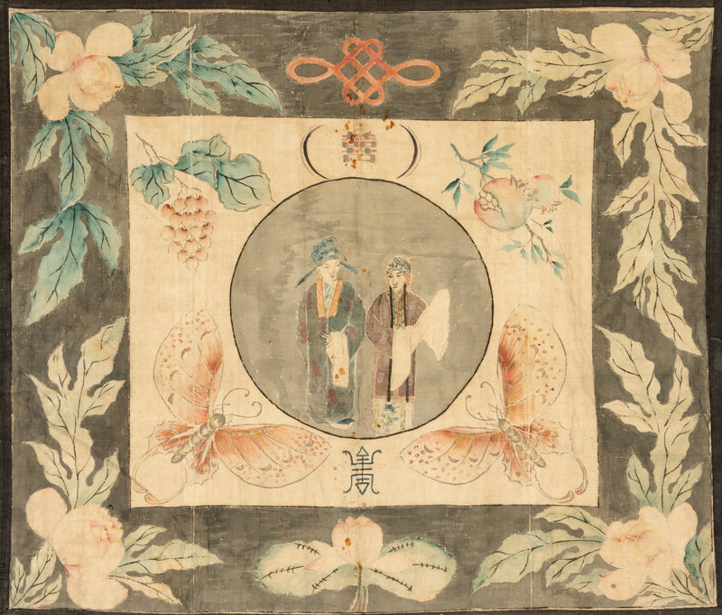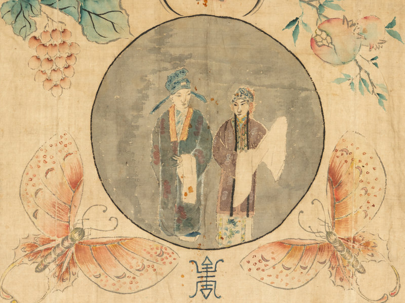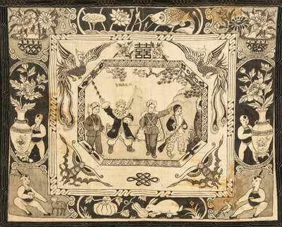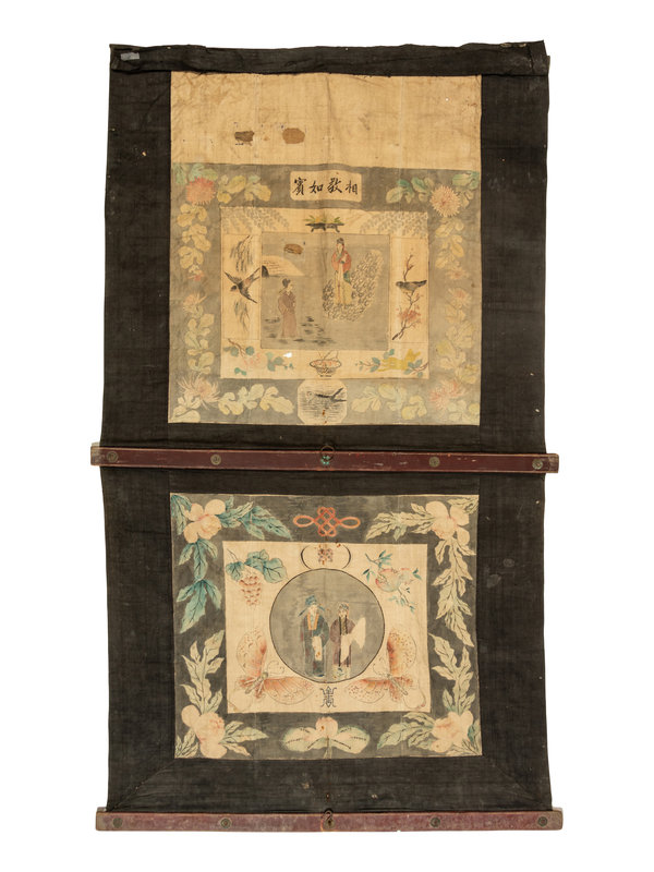 mounted with wood and metal rings to a black ground as two festive hangings, the first showing two pairs of figures reserved with flowers, fruits, and butterflies, the second densely worked with figures and animals, mounted with black tassels.