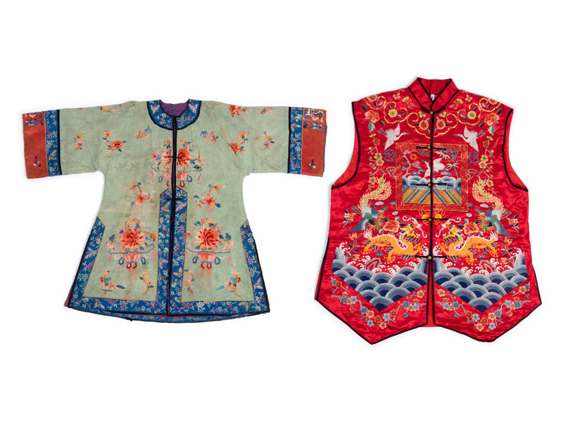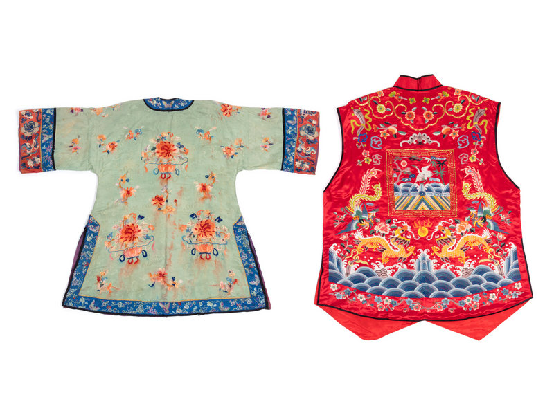 the first a green ground lady's jacket with centrail closures, the second a red ground vest worked with confronting dragons.