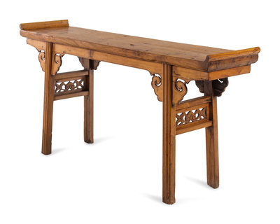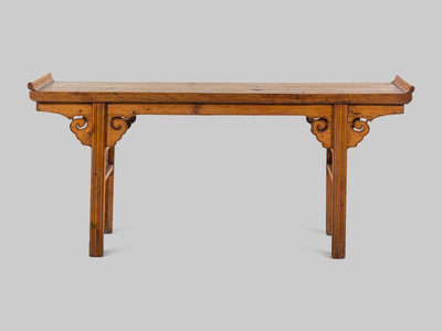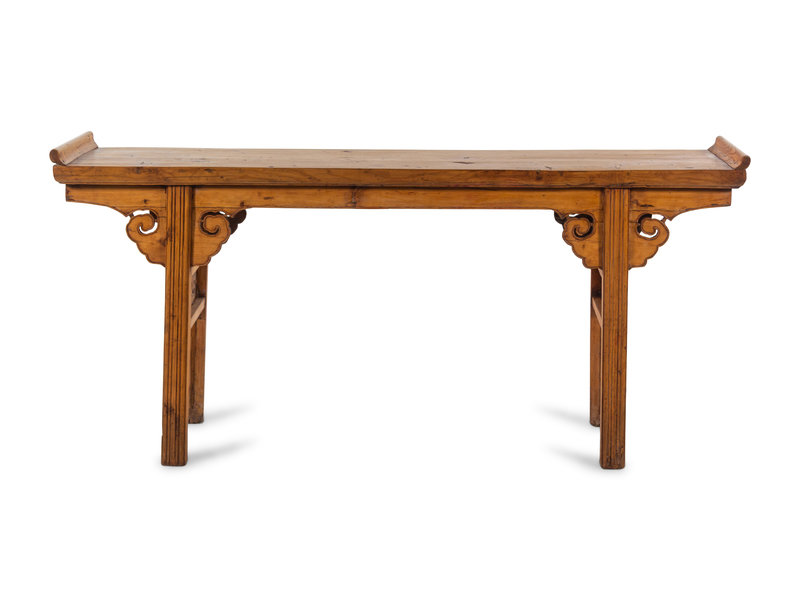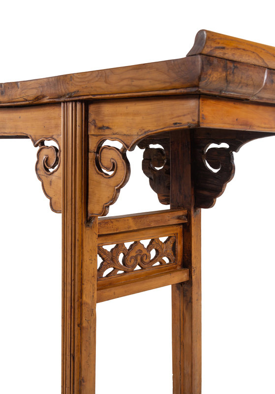 the thick paneled top of rectangular sections terminating with everted ends, all above a plain aprons and shaped ruyi spandrels supporting beaded legs joined by two openwork stretchers.