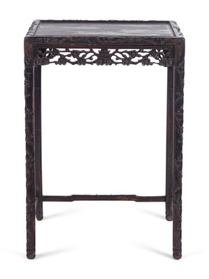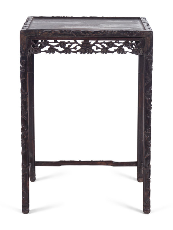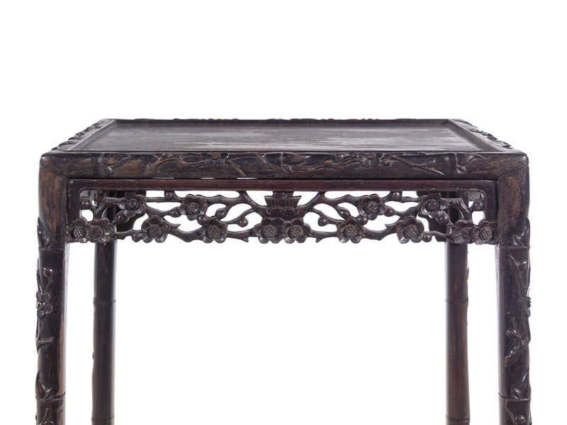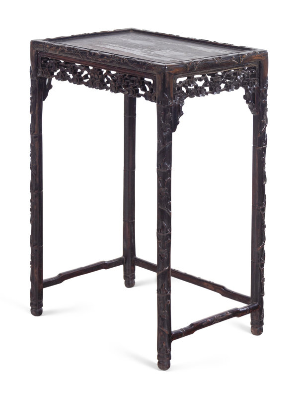 of rectangular section, with ornate aprons carved and reticulated with prunus buds, having four circular sectioned legs carved imitating bamboo joined by three curvilinear rails.