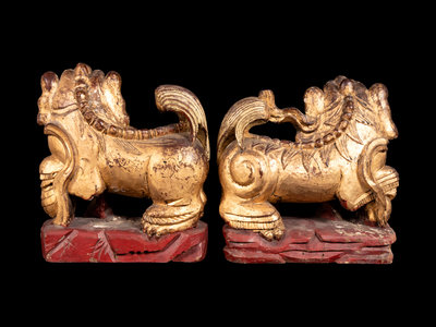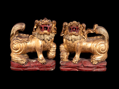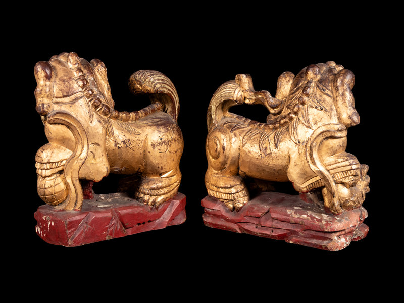 A Pair of Chinese Gilt and Red Lacquered Wood Figures of Fu Lions
