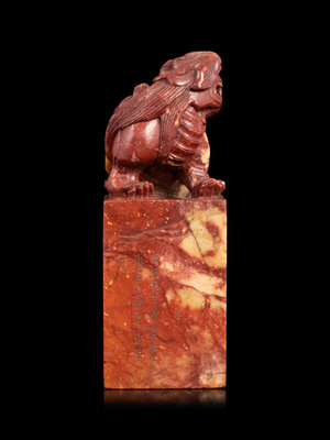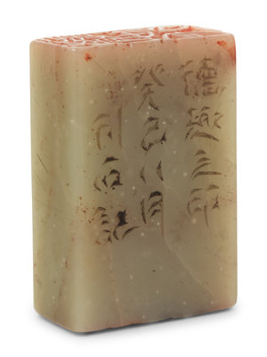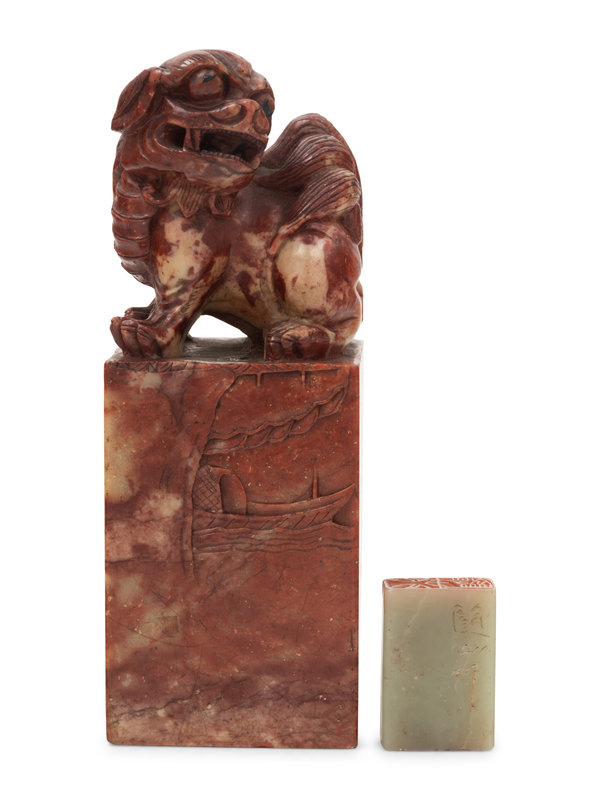 the first a celadon jade example, dated year guisi (1893) to the side, the seal facing reading dequ and sui xin xing. The second a russet and celadon soapstone example with carved foo lion finial, dated year renxu (1982) to the side, the seal facing reading ping sheng zi wen wu ta pi wei you yin jiu he shu shi.