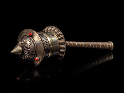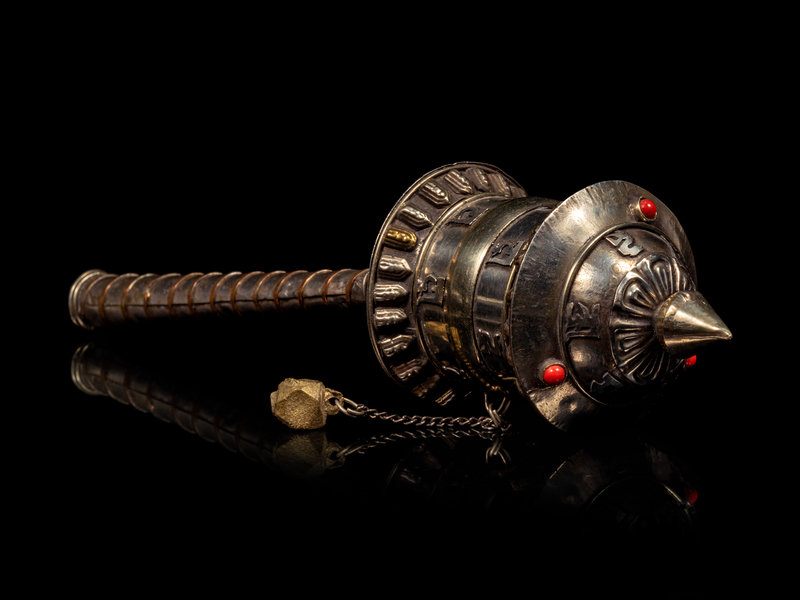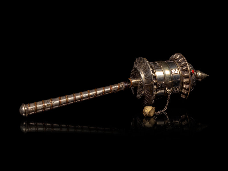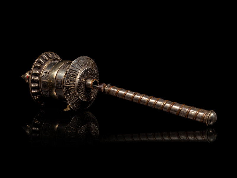 the praying wheel carved with two bands of calligraphy below petals and a bud finial, the side with chain and attached toggle, with a turned cylindrical handle.