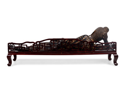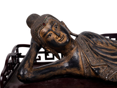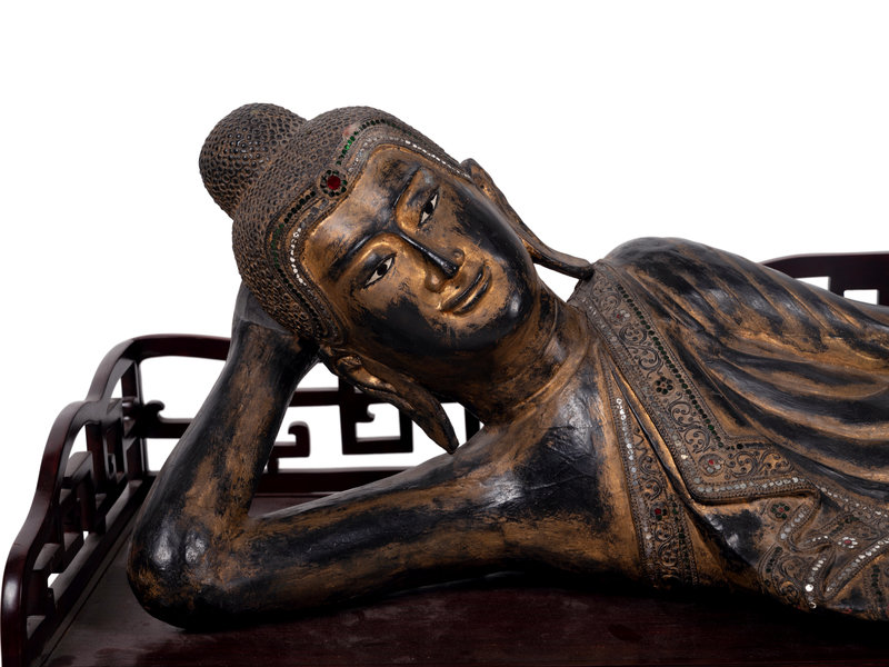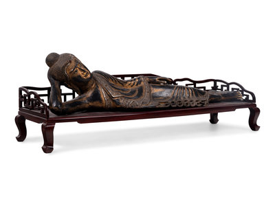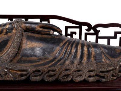 A Thai Gilt Decorated Black Lacquered Wood Figure of Reclining Buddha