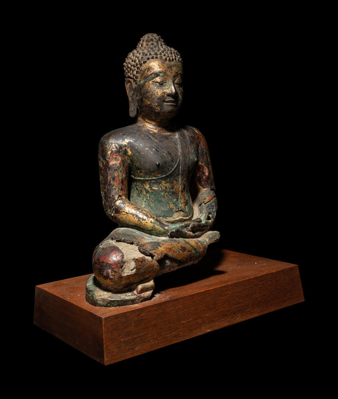 cast seated in a meditative posture with hands clasped, the surface showing polychrome encrustations.