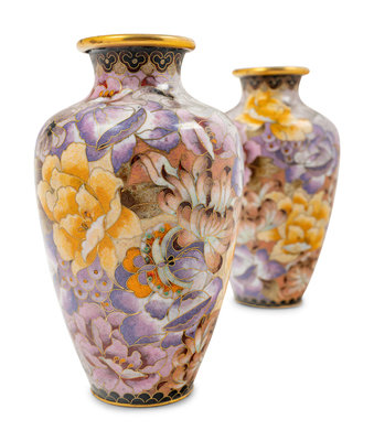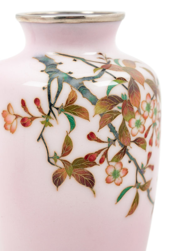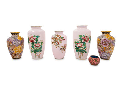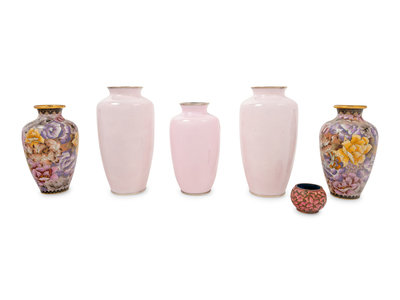 Six Japanese Pink Ground Cloisonné Enamel Vessels