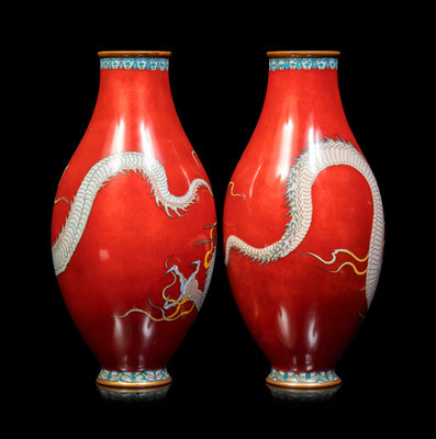 the first of melon form with bulbous bodies between the tapered feet and mouth, decorated with large sinuous dragons against the red ground; the second of baluster form, decorated to either side with front-facing dragons reserved to a lattice ground with cloud scroll borders.