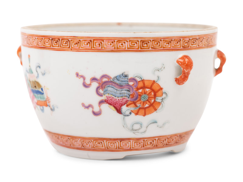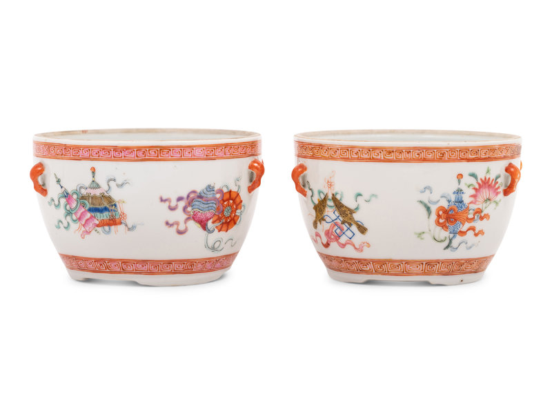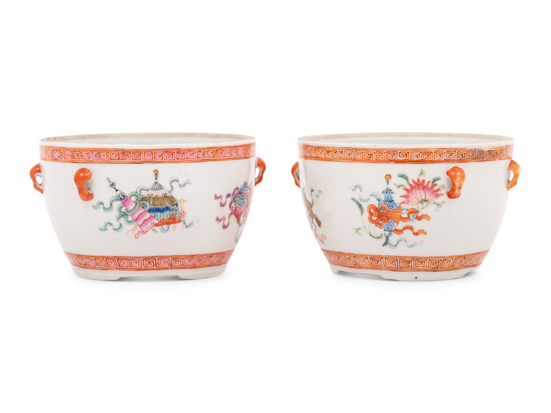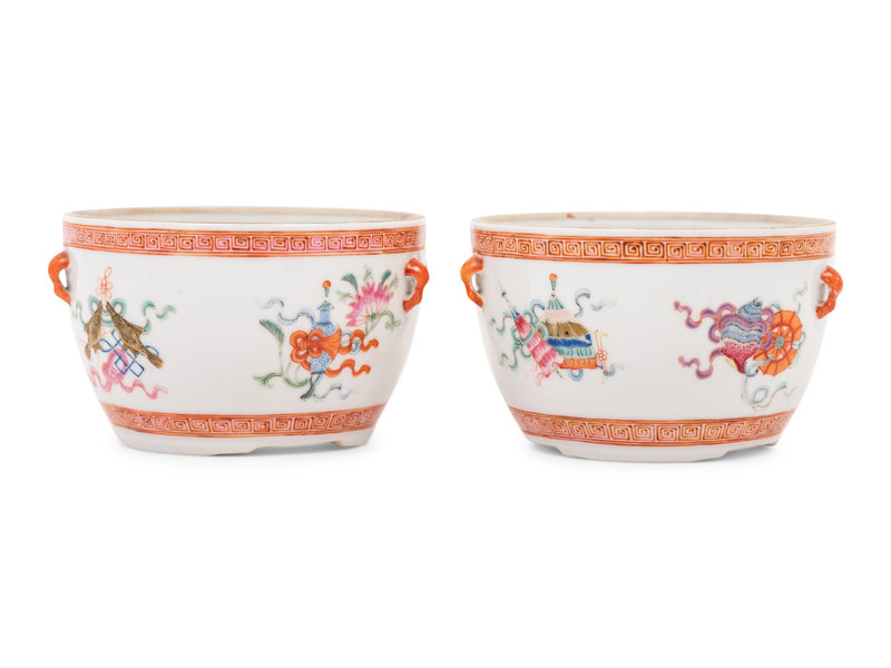 each having rounded walls, the exterior finely painted with eight Buddhist emblems between two irond red keyfret bands, the shoulder applied with two pairs of loop-form handles.