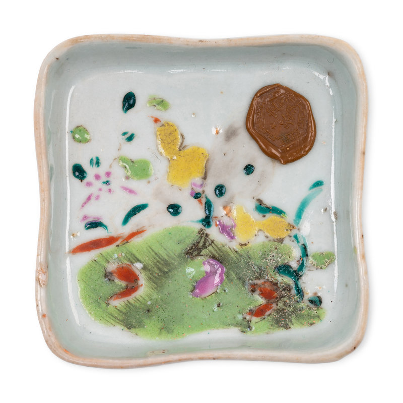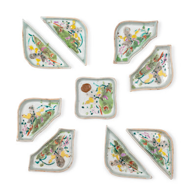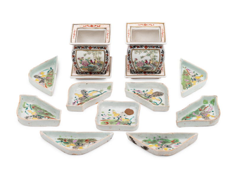 the pair of cachepots decorated with birds amongst flowers, the sweet meat set painted with butterflies.