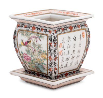 Length of longest dish 5 7/8 in., 15 cm.; Height of cachepots with base 4 in., 10.1 cm.