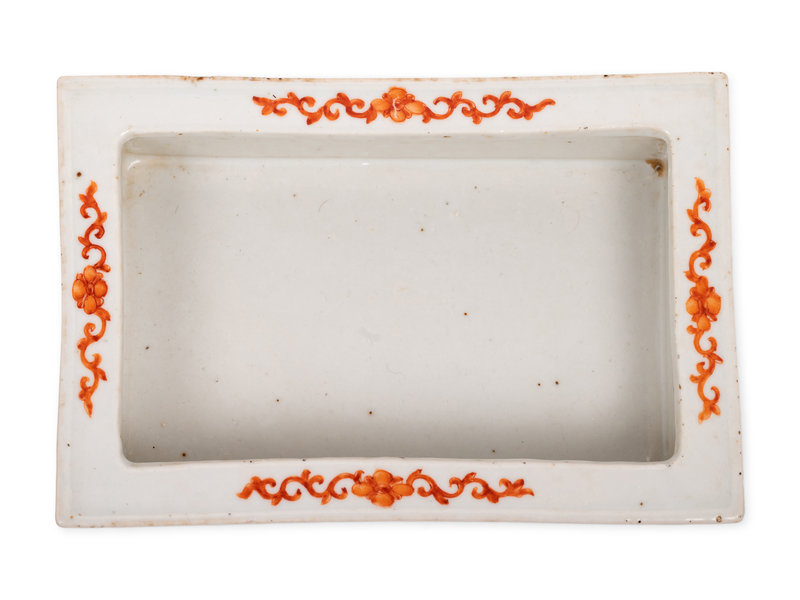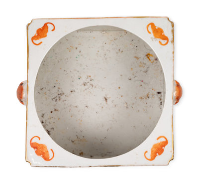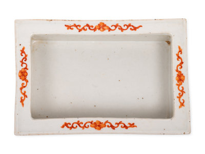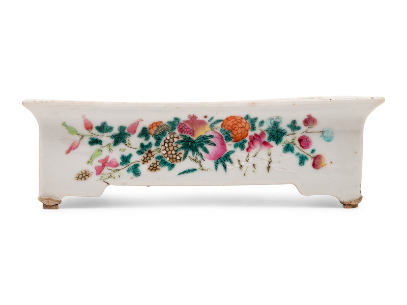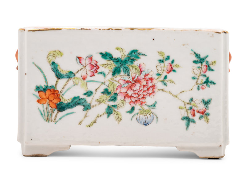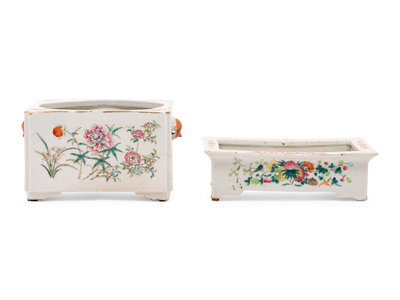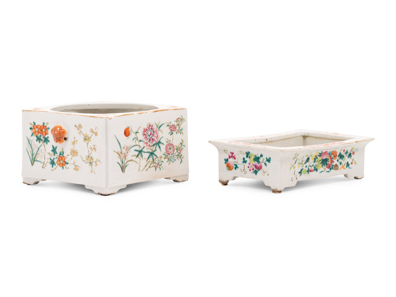 the first a square brush washer, the second a rectangular planter, each with floral decoration.