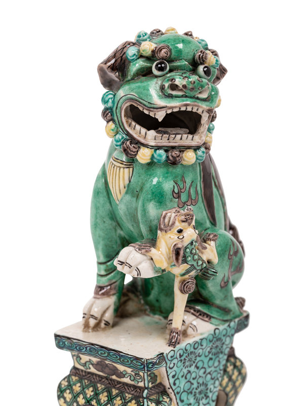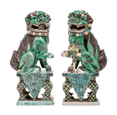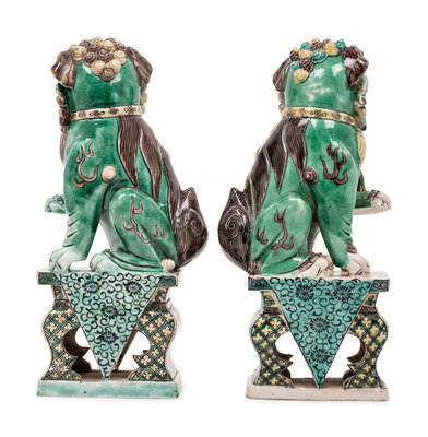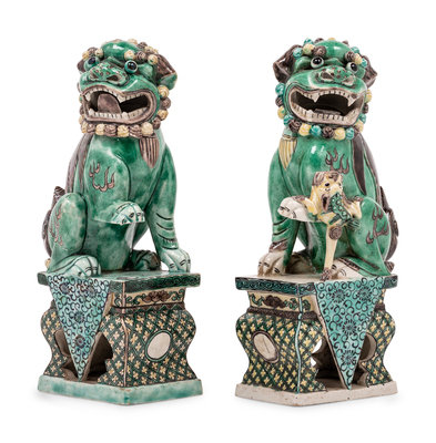A Pair of Chinese Famille Verte Porcelain Figures of Fu Lions