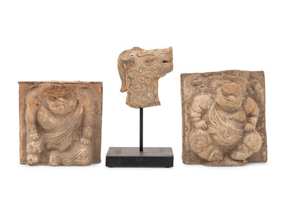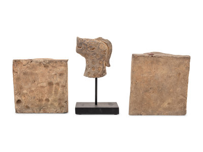 comprising two square tile carved in relief with figures, and a carved head of a spotted mythical beast, each bearing a wax customs stamp.