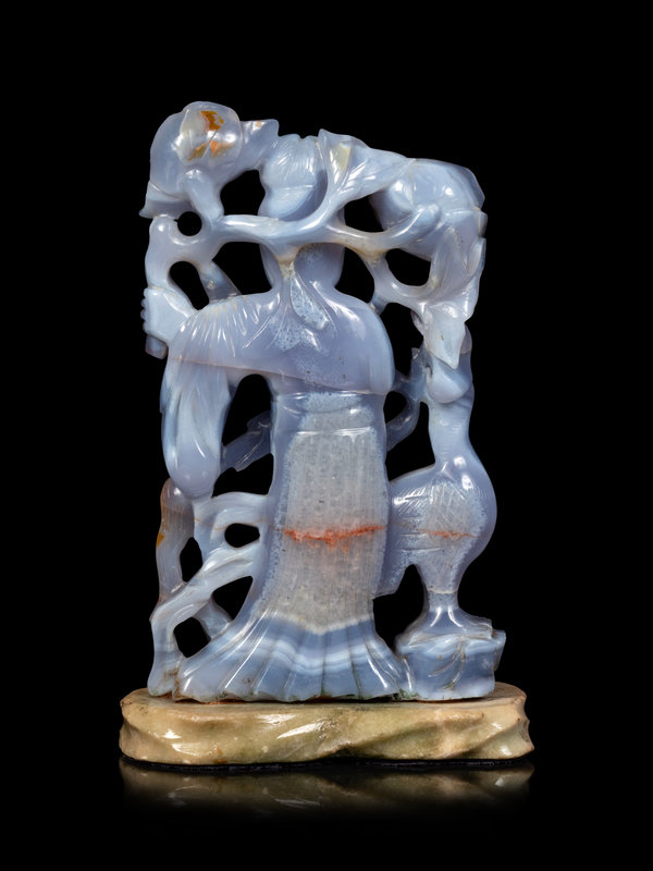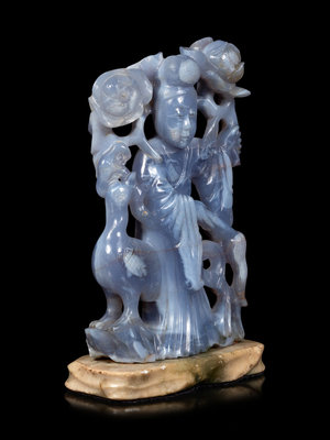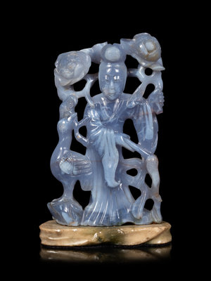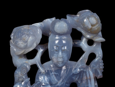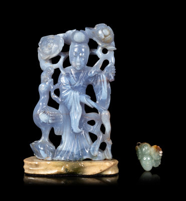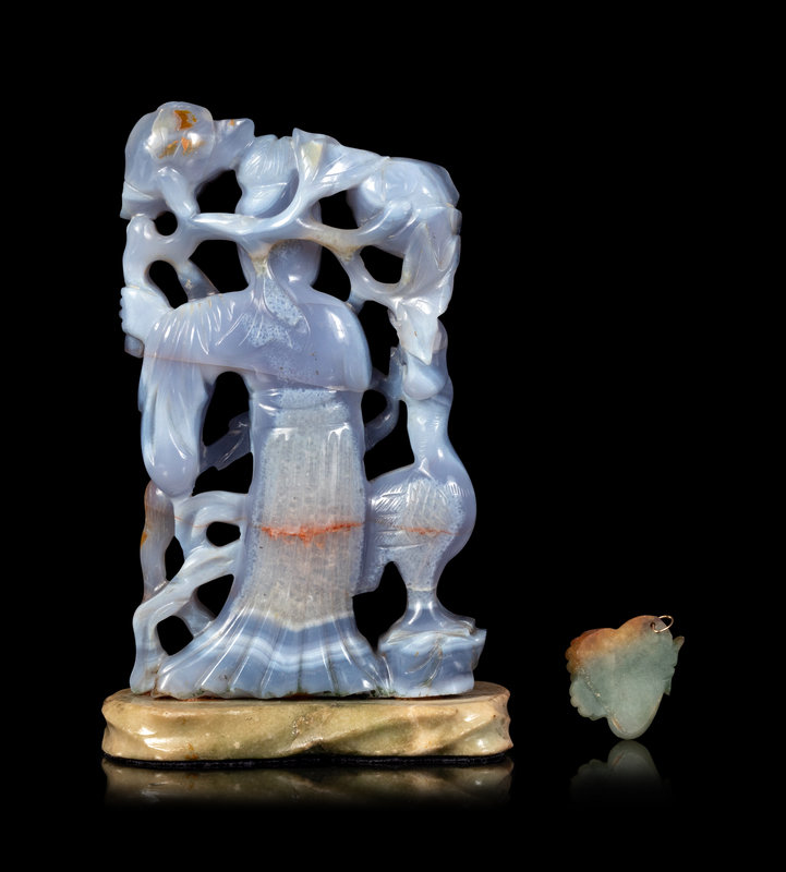 comprising a carved agate figure of a female immortal, and jadeite fragment of a head.