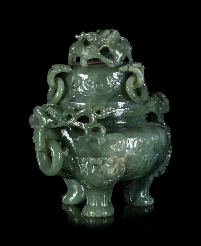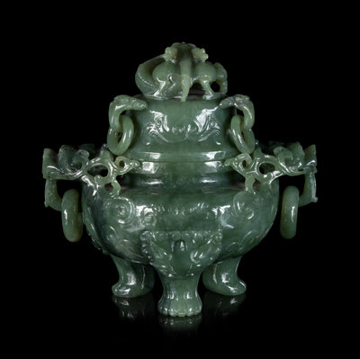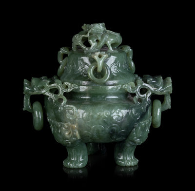 A Chinese Celadon Jadeite Incense Burner and Cover