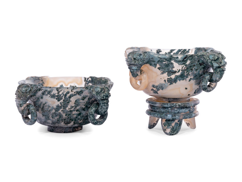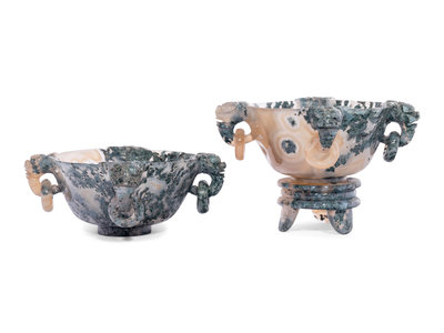 A Pair of Chinese Carved Black and Banded Agate Libation Cups and Stands