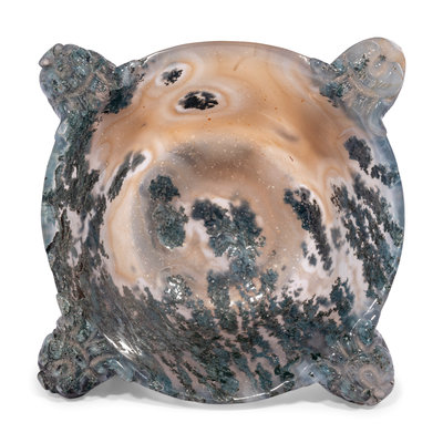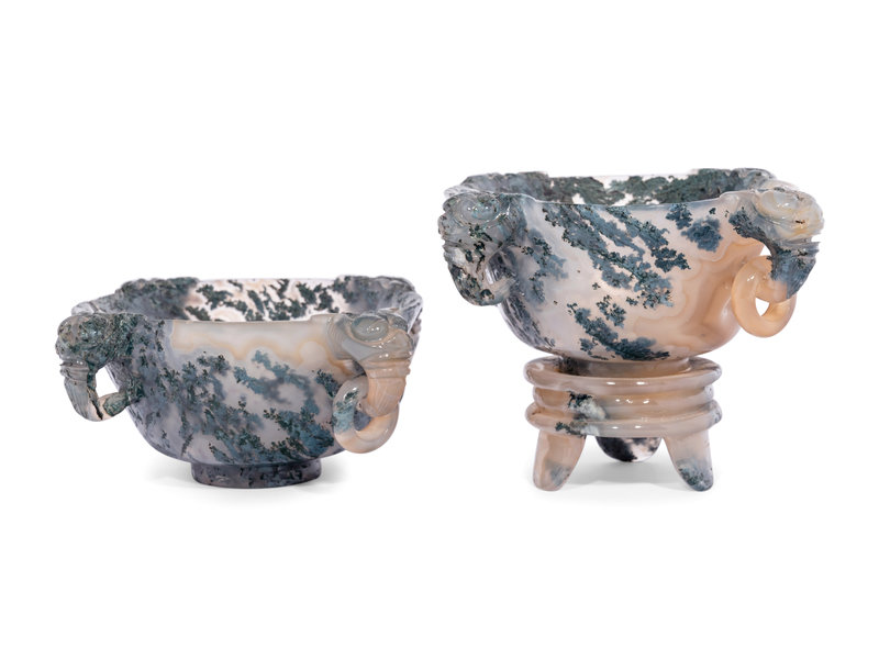 each has four beast-head handles, the stone is of a creamy greyish-russet tone with some dark green inclusions.