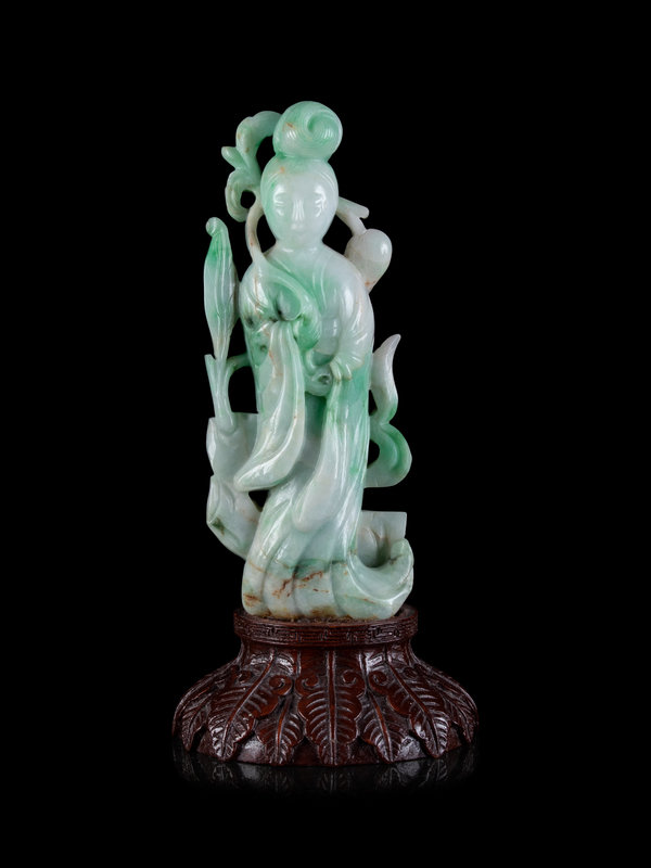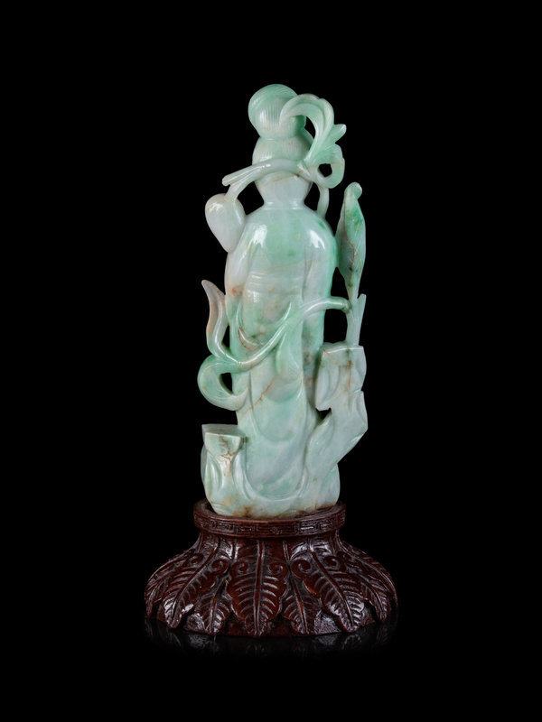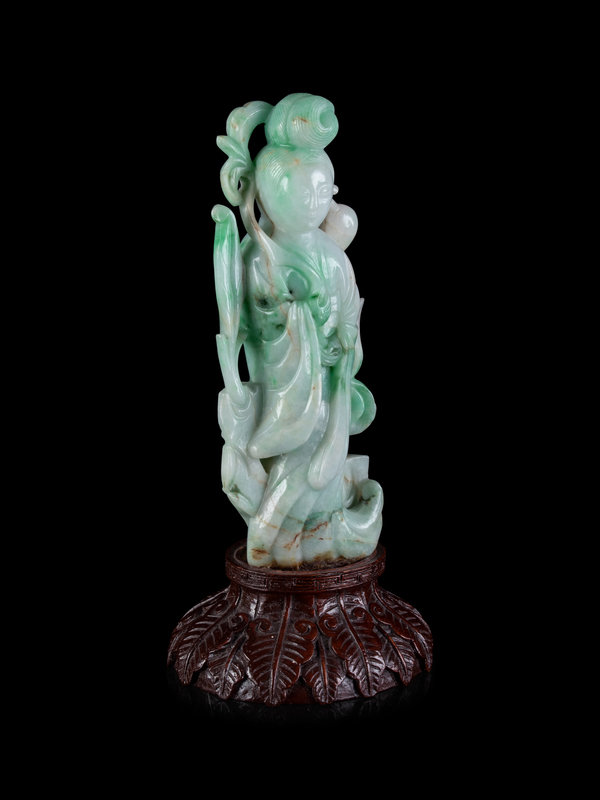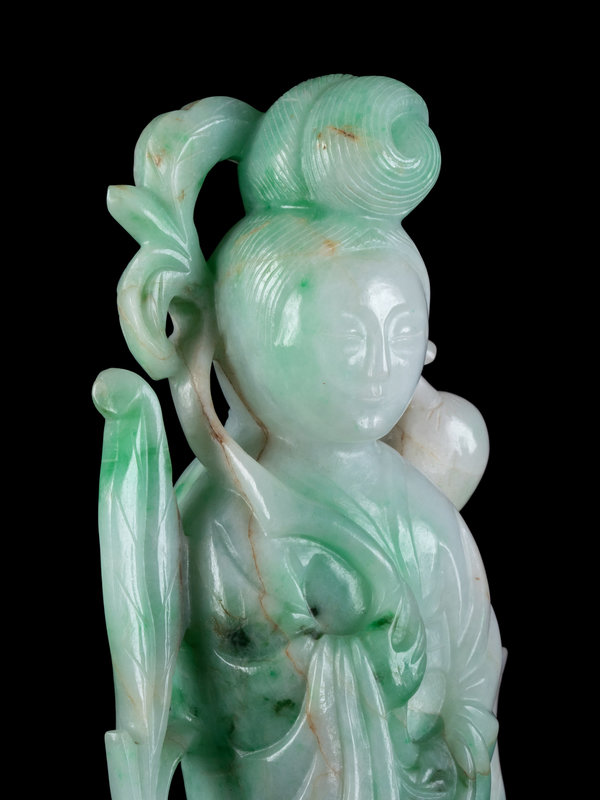 A Chinese Apple Green and Pale Celadon Jadeite Figure of Guanyin