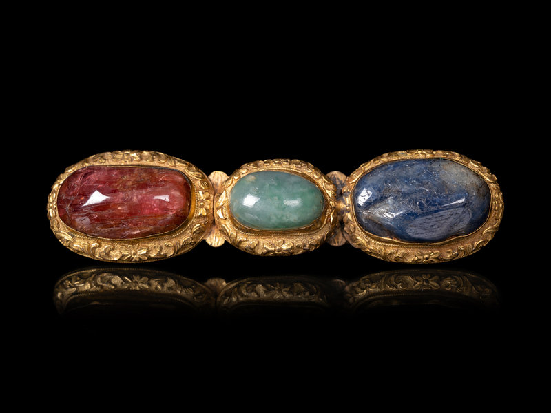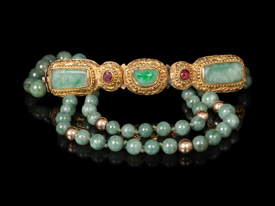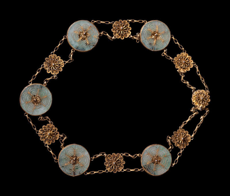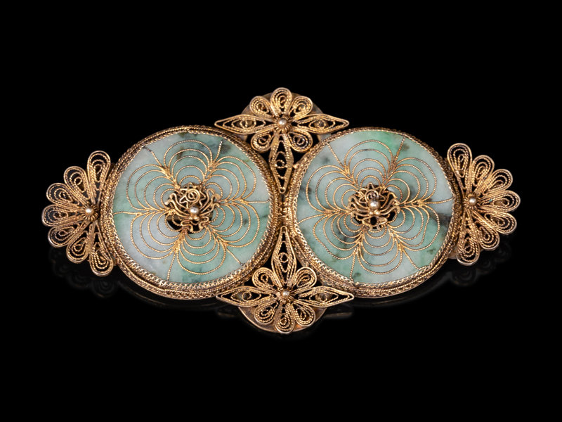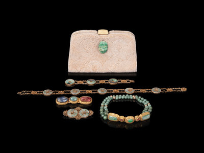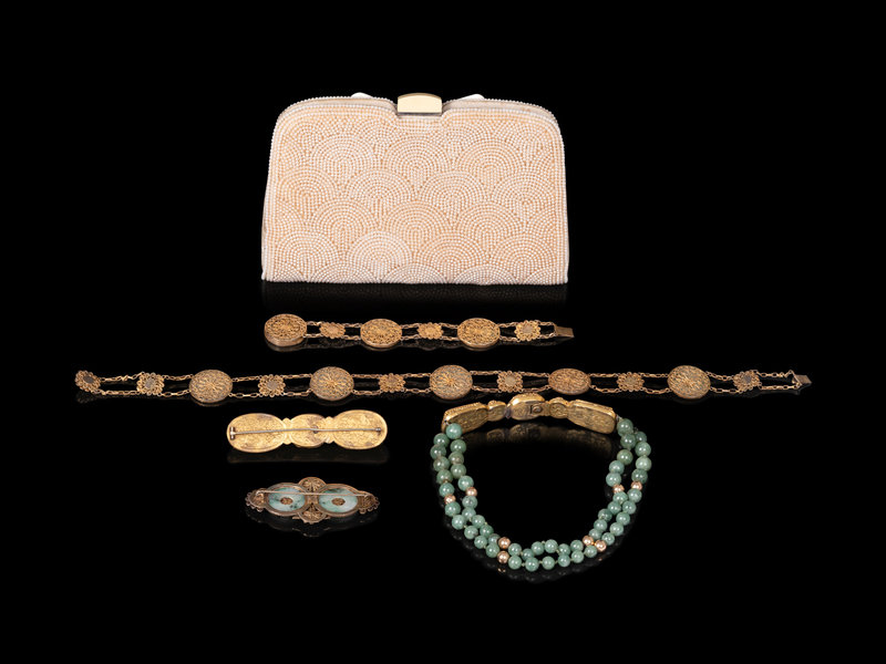 comprising a gilt silver and ruby choker necklace, a gilt silver jadeite broach, and a beaded pearl purse mounted with a jadeite plaque, and a silver filigree jadeite and hardstone broach, bracelet, and necklace set.
